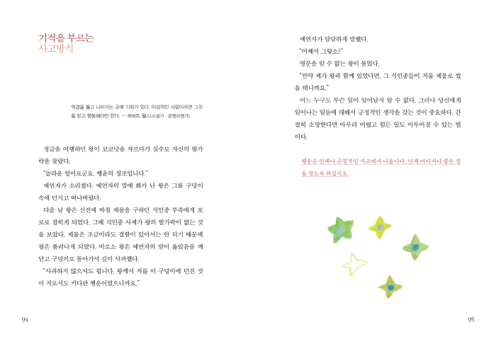 Á¤±ÛÀ» ¿©ÇàÇÏ´ø ¿ÕÀÌ ÄÚÄÚ³ÓÀ» ÀÚ¸£´Ù°¡ ½Ç¼ö·Î ÀÚ½ÅÀÇ ¹ß°¡¶ôÀ» Àß¶ú´Ù. ¡°³î¶ó¿î ÀÏÀ̷২ä. Çà¿îÀÇ Â¡Á¶ÀÔ´Ï´Ù.¡± ¿¹¾ðÀÚ°¡ ¼Ò¸®ÃÆ´Ù. ¿¹¾ðÀÚÀÇ ¸»¿¡ Ȱ¡ ³ ¿ÕÀº ±×¸¦ ±¸µ¢ÀÌ ¼Ó¿¡ ´øÁö°í ¶°³ª¹ö·È´Ù. ´ÙÀ½ ³¯ ¿ÕÀº ½ÅÀü¿¡ ¹ÙÄ¥ Á¦¹°À» ±¸ÇÏ´ø ½ÄÀÎÁ¾ ºÎÁ·¿¡°Ô Æ÷·Î·Î ÀâÈ÷°Ô µÇ¾ú´Ù. ±×¶§ ½ÄÀÎÁ¾ »çÁ¦°¡ ¿ÕÀÇ ¹ß°¡¶ôÀÌ ¾ø´Â °ÍÀ» º¸¾Ò´Ù. Á¦¹°Àº Á¶±ÝÀÌ¶óµµ °áÇÔÀÌ À־ ¾È µÇ±â ¶§¹®¿¡ ¿ÕÀº Ç®·Á³ª°Ô µÇ¾ú´Ù. ºñ·Î¼Ò ¿ÕÀº ¿¹¾ðÀÚÀÇ ¸»ÀÌ ¿Ç¾ÒÀ½À» ±ú´Ý°í ±¸µ¢ÀÌ·Î µ¹¾Æ°¡¼ ±íÀÌ »ç°úÇß´Ù. ¡°»ç°úÇÏÁö ¾ÊÀ¸¼Åµµ µË´Ï´Ù. ¿Õ²²¼ Àú¸¦ ÀÌ ±¸µ¢ÀÌ¿¡ ´øÁø °ÍÀÌ Àú·Î¼µµ Ä¿´Ù¶õ Çà¿îÀ̾úÀ¸´Ï±î¿ä.¡± ¡°¾î°¼ ±×·¸¼Ò?¡± ¡°¸¸¾à Á¦°¡ ¿Õ°ú ÇÔ²² ÀÖ¾ú´Ù¸é, ±× ½ÄÀÎÁ¾µéÀÌ Àú¸¦ Á¦¹°·Î ½èÀ» Å״ϱî¿ä.¡± ¾î´À ´©±¸µµ ¹«½¼ ÀÏÀÌ ÀϾÁö ¾Ë ¼ö ¾ø´Ù. ±×·¯³ª ´ç½Å¿¡°Ô ÀϾ´Â Àϵ鿡 ´ëÇØ¼ ±àÁ¤ÀûÀÎ »ý°¢À» °®´Â °ÍÀÌ Áß¿äÇÏ´Ù. °£ÀýÈ÷ ¼Ò¸ÁÇÑ´Ù¸é ¾Æ¹«¸® ¾î·Æ°í Èûµç Àϵµ ÀÌ·ç¾îÁú ¼ö ÀÖ´Â ¹ýÀÌ´Ù.
