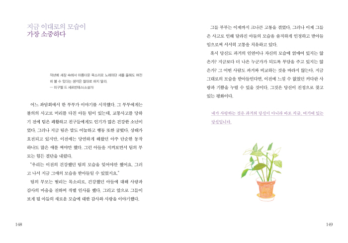(¡¦¡¦) ±× ºÎºÎ¿¡°Ô´Â ºÒÀÇÀÇ »ç°í·Î ¸Ó¸®¸¦ ´ÙÄ£ ¾Æµé ÆÀÀÌ Àִµ¥, ±³Åë»ç°í¸¦ ´çÇϱâ Àü¿¡ ÆÀÀº ÄèȰÇϰí Ä£±¸µé¿¡°Ôµµ ÀαⰡ ¸¹Àº °Ç°ÇÑ ¼Ò³âÀ̾ú´Ù. ±×·¯³ª Áö±Ý ÆÀÀº ¸»µµ ¾î´Çϰí Çൿ ¶ÇÇÑ ±À¶¹´Ù. (¡¦¡¦) ¡°¿ì¸®´Â ÀÌÀüÀÇ °Ç°Çß´ø ÆÀÀÇ ¸ð½ÀÀ» Àؾî¾ß¸¸ Çß¾î¿ä. ±×·¯°í ³ª¼ Áö±Ý ±×¾ÖÀÇ ¸ð½ÀÀ» ¹Þ¾ÆµéÀÏ ¼ö ÀÖ¾úÁö¿ä.¡± ÆÀÀÇ ºÎ¸ð´Â ¶³¸®´Â ¸ñ¼Ò¸®·Î, °Ç°Çß´ø ¾Æµé¿¡ ´ëÇØ »ç¶û°ú °¨»çÀÇ ¸¶À½À» ÀüÇϸç ÀÛº° Àλ縦 Çß´Ù. ±×¸®°í ¾ÕÀ¸·Î ±×µéÀÌ º¸°Ô µÉ ¾ÆµéÀÇ »õ·Î¿î ¸ð½À¿¡ ´ëÇÑ °¨»ç¿Í »ç¶ûÀ» À̾߱âÇß´Ù. (¡¦¡¦) Ȥ½Ã ´ç½Åµµ °ú°ÅÀÇ Àο¬À̳ª ÀÚ½ÅÀÇ ¸ð½À¿¡ ¾ô¸Å¿© ÀÖÁö´Â ¾ÊÀº°¡? ±× ¾î¶² »ç¶÷µµ °ú°Å¿Í ºñ±³ÇÏ´Â °ÍÀ» ¹Ù¶óÁö ¾Ê´Â´Ù. Áö±Ý ±×´ë·ÎÀÇ ¸ð½ÀÀ» ¹Þ¾ÆµéÀδٸé, ÀÌÀü¿¡ ´À³¥ ¼ö ¾ø¾ú´ø Ä¿´Ù¶õ »ç¶û°ú ±â»ÝÀ» ´©¸± ¼ö ÀÖÀ» °ÍÀÌ´Ù. ±×°ÍÀº ´ç½ÅÀÌ ÁøÁ¤À¸·Î ã°í ÀÖ´Â ÆòÈÀÌ´Ù.