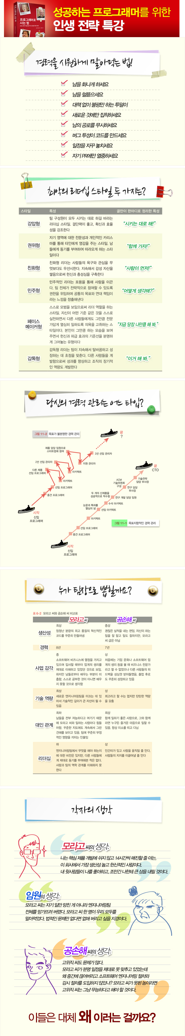 ÀÌ Ã¥Àº Åö ±î³õ°í ¾ê±âÇÏÀÚ¸é ¼ÒÇÁÆ®¿þ¾î ¾÷°è¿¡¼ ¼º°øÇÏ´Â ¹æ¹ý¿¡ °üÇÑ Ã¥ÀÌ´Ù. Á÷Àå¿¡¼ ¼º°øÇÏ´Â ¹æ¹ý¿¡ ´ëÇÑ Ã¥ÀÌ ¼ö¾øÀÌ ¸¹ÀÌ ³ª¿Í ÀÖÁö¸¸, ¼ÒÇÁÆ®¿þ¾î ¾÷°è Á¾»çÀÚµéÀ» À§ÇÑ Ã¥Àº ±×¸® ¸¹Áö ¾Ê´Ù. ÀÌ´Â ¼ÒÇÁÆ®¿þ¾î ¾÷°è¿¡¼´Â À¯³È÷ °³ÀÎÀÇ Àü¹®ÀûÀÎ ¿ª·®ÀÌ °Á¶µÇ±â ¶§¹®À̱⵵ Çϰí, ¼ÒÇÁÆ®¿þ¾î ¾÷°è Á¾»çÀÚµéÀÌ Æò±ÕÀûÀ¸·Î Á¶Á÷¿¡ ¾ô¸ÅÀÌÁö ¾ÊÀ¸·Á´Â ¼ºÇâÀÌ ¸Å¿ì °Çϱ⠶§¹®À̱⵵ ÇÒ °ÍÀÌ´Ù. ¼ÒÇÁÆ®¿þ¾î ºÐ¾ß¿¡¼ÀÇ Àü¹®°¡·Î¼ÀÇ ¿ª·®Àº µÎ¸»ÇÒ ÇÊ¿ä ¾øÀÌ Áß¿äÇÏ´Ù. ±×·¯³ª Àü¹®¼º ¿Ü¿¡ ÆÀÀ» ÀÌ·ï¼ ÀÏÇÏ´Â ¿ª·®µµ ¸Å¿ì Áß¿äÇϸç, À§·Î ¿Ã¶ó°¥¼ö·Ï ¸®´õ½ÊÀÌ Á¡Á¡ Áß¿äÇØÁø´Ù. ÀÌ Ã¥Àº ´Ù¸¥ ¼ö¸¹Àº Àü¹®¼Àû¿¡¼´Â Àß ´Ù·çÁö ¾Ê´Â, Á¶Á÷»ýȰ¿¡ ÇÊ¿äÇÑ ±â¼úÀ» ¼Ò°³Çϴ åÀÌ´Ù.