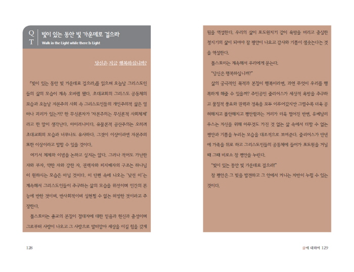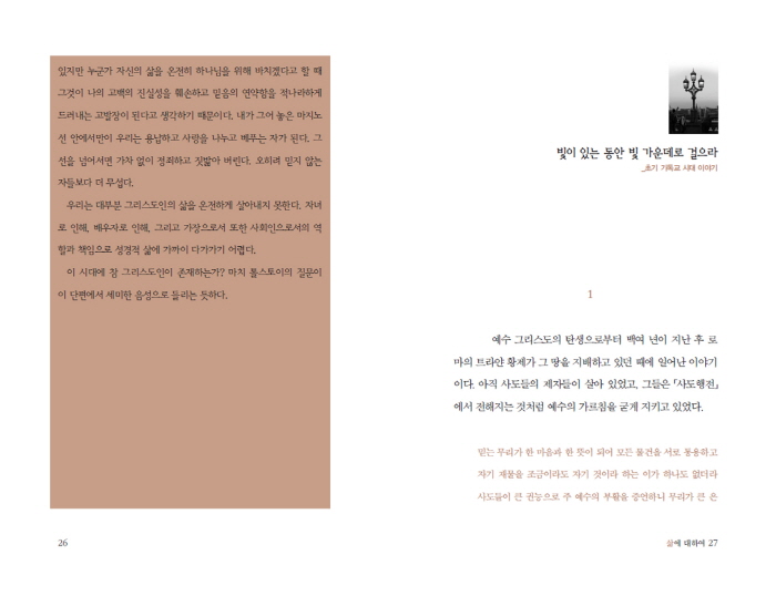Çѱ¹ ±âµ¶±³ÀÇ Çö½ÇÀ» º¸¸é ³Ê¹«³ª ¿ÜÇüÀû ¼ºÀå¿¡ Ä¡¿ìÄ¡°í ¼¼»ó°ú ŸÇùÇÏ°í ¹°ÁúÁÖÀÇ¿¡ Á¥¾î ÀÖ´Â °ÍÀ» º¼ ¶§ °ú¿¬ ±× ¾È¿¡ ¿¹¼ö ±×¸®½ºµµ°¡ ¿ì¸®¿¡°Ô ÀüÇϰíÀÚ ÇÑ Âü »ç¶ûÀÌ »ì¾Æ ÀÖ´ÂÁö ÀDZ¸½ÉÀÌ °¡´Â °ÍÀÌ ¼ÖÁ÷ÇÑ ½ÉÁ¤À̾ú´Ù. ±×·±µ¥ Å罺ÅäÀÌÀÇ ÀÛǰµéÀ» ÅëÇØ ±×·± °¡½¿ ´ä´äÇÑ Àǹ®ÀÌ Á» ´õ ÇØ°¥µÇ¾ú´Ù. -¿Å±äÀÌÀÇ ¸» Áß¿¡¼