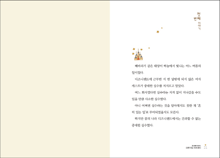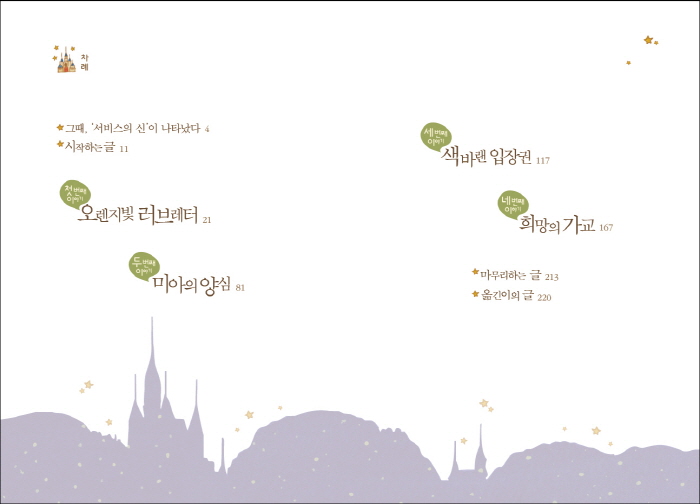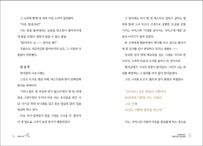 ¿ì¸®´Â »ç½Ç ¸ðµÎ°¡ ´©±º°¡¸¦ À§ÇØ, ¸¶¹ýó·³ ¡®Æ¯º°ÇÑ Á¸À硯°¡ µÉ ¼ö ÀÖ½À´Ï´Ù. µðÁî´Ï·£µå¿¡¼ ÀÏÇϴ ij½ºÆ®µéµµ ¸¶Âù°¡ÁöÁÒ. ±×µéÀº °ø¿øÀÇ ÇÏ·ç¿¡ ¾îÁ¦¿Í ¶È°°Àº ÇÏ·ç´Â ¾ø´Ù´Â °ÍÀ» Àß ¾Ë°í ÀÖ½À´Ï´Ù. ÇÏ·ç¿¡ ¸î ¸¸ ¸íÀ̳ª µÇ´Â °í°´ ÇÑ ¸í ÇÑ ¸íÀÌ °ø¿ø¿¡¼ º¸³»´Â ÇÏ·ç´Â ¡®¹«¾ù°úµµ ¹Ù²Ü ¼ö ¾ø´Â¡¯ ¾î¶² °Í. ¾î¶² »ç¶÷¿¡°Ô´Â ¡®¼ÒÁßÇÑ »ç¶÷°úÀÇ Æò»ý¿¡ ÇÑ ¹ø»ÓÀÎ ³¯¡¯ÀÏÁöµµ ¸ð¸£°í, ¶Ç ¾î¶² »ç¶÷¿¡°Ô´Â ¡®ÈçÇϵðÈçÇÑ, ±×·¯³ª ¿À·¡µµ·Ï ±â¾ï¿¡ ³²´Â ±ÍÁßÇÑ ÈÞÀÏ¡¯ÀÏÁöµµ ¸ð¸¨´Ï´Ù. ±×·¸±â¿¡ ij½ºÆ®µéÀº °í°´°ú Á¢ÇÏ´Â ¸Å ¼ø°£, Àڱ׸¶ÇÑ ¼±¹°À» ¼±»çÇÏ·Á ¾Ö¾¹´Ï´Ù. 7¸¸ ¸íÀÇ °í°´ÀÌ ÀÖ´Ù¸é 7¸¸ ¸í ¸òÀÇ ÇູÀ» °¢ÀÚÀÇ ÀÏ ¼Ó¿¡¼ ¸¸µé¾î³»·Á ÇÕ´Ï´Ù. ±×·± °÷¿¡ µðÁî´Ï·£µå ¡®¼ºñ½ºÀÇ ½Å¡¯ÀÌ ³ªÅ¸³³´Ï´Ù. »ç¶÷µéÀº ±×°ÍÀ» ¡®¸¶¹ý¡¯À̶ó ºÎ¸£±âµµ ÇÏ°í ¶Ç ¡®²Þ¡¯À̶ó ºÎ¸£±âµµ ÇÕ´Ï´Ù. ¡ª 215p