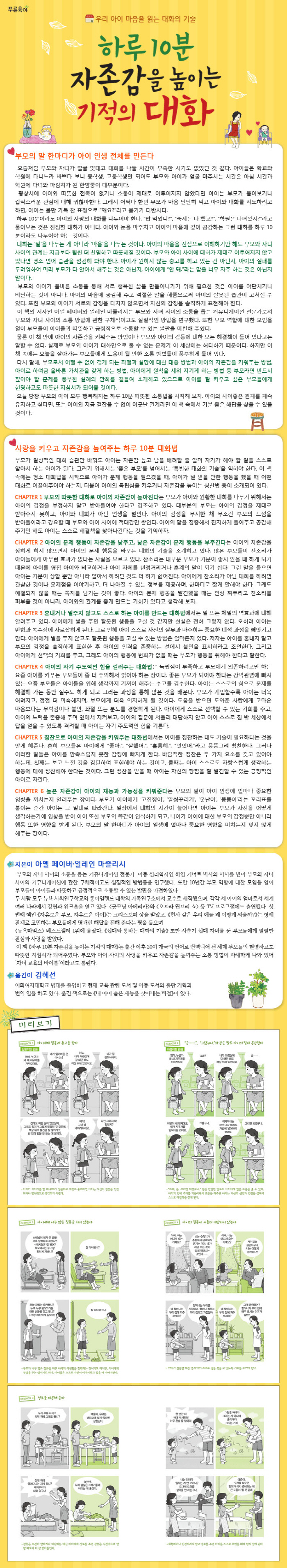ÀÌ Ã¥ ¡¶ÇÏ·ç 10ºÐ ÀÚÁ¸°¨À» ³ôÀÌ´Â ±âÀûÀÇ ´ëÈ¡·´Â Ãâ°£ ÀÌÈÄ 20¿© °³±¹ÀÇ ¾ð¾î·Î ¹ø¿ªµÇ¾î Àü ¼¼°è ºÎ¸ðµéÀÇ Çö¸íÇÏ°íµµ µû¶æÇÑ Áöħ¼°¡ µÇ¾îÁÖ¾ú´Ù. ºÎ¸ð¿Í ¾ÆÀÌ »çÀÌÀÇ »ç¶ûÀ» Ű¿ì°í ÀÚÁ¸°¨À» ³ô¿©ÁÖ´Â ¼ÒÅë ¹æ¹ýÀÌ ÀÚ¼¼ÇÏ°Ô ³ª¿Í ÀÖ¾î ¡®ÀÚ³à ±³À°ÀÇ ¹ÙÀÌºí¡¯À̶ó°íµµ ºÒ¸°´Ù.