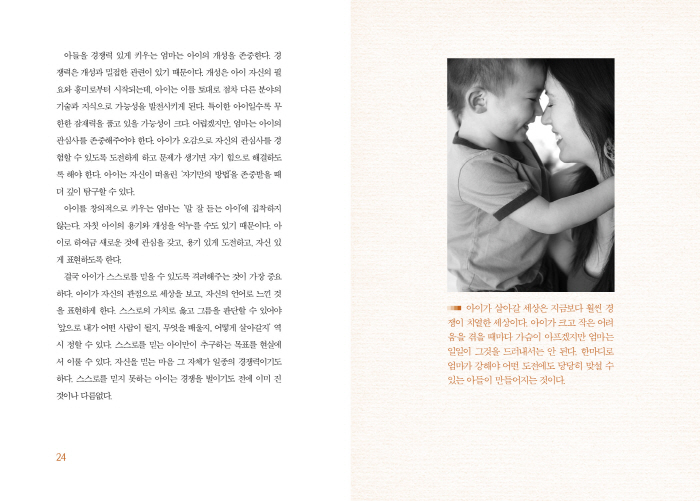 º£ÀÌ¡´ëÇб³ Áß¹®°ú¸¦ Á¹¾÷ÇßÀ¸¸ç Áß±¹ ±¹°¡µµ¼»óÀ» ¼ö»óÇÑ º£Å×¶û µµ¼ ±âȹÀÚÀÌÀÚ ÀÛ°¡ÀÌ´Ù. ¸¹Àº ¾ö¸¶µéÀÌ ¾ÆµéÀ» Ű¿ì¸ç È¥¶õ°ú ÁÂÀýÀ» °Þ´Â ¸ð½ÀÀ» º¸°í ÀÌ Ã¥À» ±¸»óÇÏ°Ô µÇ¾ú´Ù. ¿©¼ºÀÇ ¼¼°è¿¡¼ ¼ºÀåÇÑ ¾ö¸¶°¡ ¡®µµ¹«Áö ÀÌÇØÇÒ ¼ö ¾ø´Â °ÍÅõ¼ºÀÌ¡¯ÀÎ ¾ÆµéÀ» ¾î¶»°Ô ÀÌÇØÇÏ°í ¿Ã¹Ù¸£°Ô ¼ÒÅëÇÏ¿© ¸¶Ä§³» ¾ÆµéÀ» ³²¼ºÀÇ ¼¼°è¿¡¼µµ ÀÎÁ¤¹Þ´Â ³²ÀڷΠŰ¿ö³¾ ¼ö ÀÖÀ»Áö¿¡ ´ëÇØ ÁýÁßÀûÀ¸·Î ºÐ¼®Çß´Ù. ±×´Â ÀÌ Ã¥À» ÅëÇØ ¾ö¸¶ÀÇ ¾ÖÁ¤ Ç¥Çö ¹× ¼ÒÅë ¹æ½ÄÀÌ ¾Æµé°ú ¼øÁ¶·Î¿î °ü°è·Î À̾îÁö°í ÀÖ´ÂÁö Æ´Æ´ÀÌ µ¹¾Æº¼ Çʿ䰡 ÀÖÀ¸¸ç, ÁÁÀº °ü°è¸¦ À̾±â À§Çؼ´Â ¾ö¸¶°¡ ¸ÕÀú ¡®¾ÆµéÀÇ ¹æ½Ä¡¯À» ÀÌÇØÇØ¾ß¸¸ ÇÑ´Ù°í ¼³¸íÇÑ´Ù.