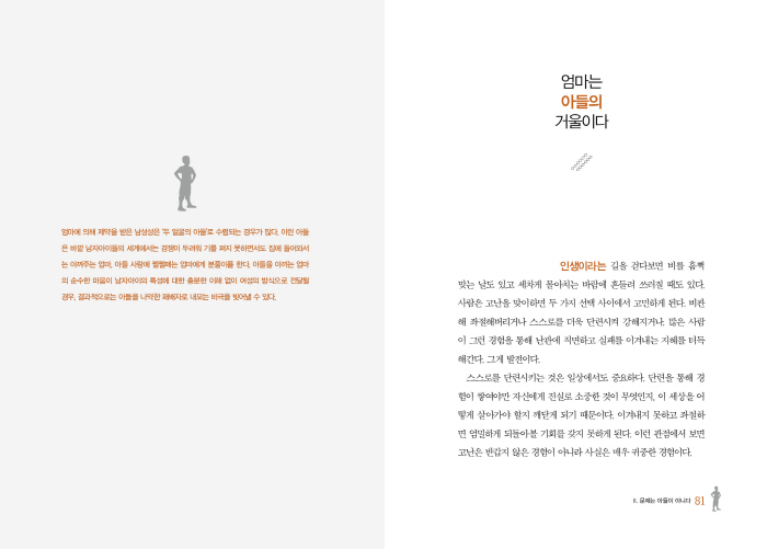 ¾ÆµéÀÌ ÀλýÀ» »ì¾Æ°¡¸ç ¾î¿ ¼ö ¾øÀÌ ¾î·Á¿ò°ú ¸¶ÁÖÃÄ¾ß ÇÑ´Ù¸é, Â÷¶ó¸® ¾ö¸¶ÀÇ ¾ÈÀüÇÑ ¼Õ±æÀ» ±â´ëÇÒ ¼ö ÀÖ´Â Áö±Ý °Þ´Â °ÍÀÌ ³´Áö ¾ÊÀ»±î. °í³Àº ÀλýÀ̶ó´Â ÇаúÀÇ Çʼö °ú¸ñÀÌÀÚ ±× ÀÚü·Î µÎ°íµÎ°í »îÀÇ ÀÚ»êÀÌ µÇ´Â °æÇèÀÌ´Ù. ¾ÆµéÀÇ ÀλýÀº ±æ´Ù. ¾ö¸¶´Â ¾ÆµéÀÌ ¾ÈÀÏÇÔ°ú °í³ °¡¿îµ¥ ½º½º·Î °í³À» ÅÃÇÔÀ¸·Î½á ÀλýÀÇ Âù¶õÇÑ °¡´É¼ºÀ» ¿òÄÑÁãµµ·Ï ³¡¾øÀÌ ¿ë±â¸¦ ºÏµ¸¿öÁÙ Çʿ䰡 ÀÖ´Ù. -p.159
