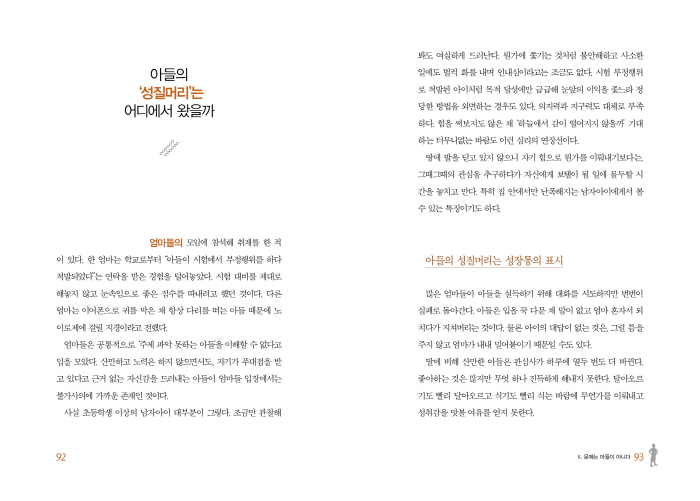 ¾ÆµéÀº ÀÚ¶ö¼ö·Ï ´õ¿í º¹ÀâÇÑ È¯°æ¿¡¼, ´Ù¾çÇÑ »ç¶÷µéÀ» ¸¸³ª¸ç »ì¾Æ°¡°Ô µÈ´Ù. ¾î·Á¼ºÎÅÍ Á¦´ë·Î µÈ »çȸ¼º°ú µ¶¸³¼ºÀ» ±æ·¯ÁÖÁö ¾ÊÀ¸¸é Èʳ¯ ´õ¿í Ä¡¿ÇÑ °æÀïÀ» µó°í ÀÏ¾î¼±â ¾î·Æ´Ù. µû¶ó¼ ¾ö¸¶´Â ½º½º·ÎÀÇ ¾ÖÁ¤ Ç¥Çö ¹× ¼ÒÅë ¹æ½ÄÀ» Æ´Æ´ÀÌ µ¹¾Æº¼ Çʿ䰡 ÀÖ´Ù. ±×·¯±â À§Çؼ´Â ¸ÕÀú ¾ÆµéÀÇ ¹æ½ÄÀ» ÀÌÇØÇØ¾ß¸¸ ÇÑ´Ù. -p.19