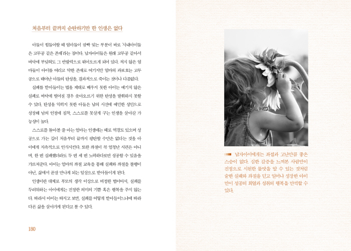 °á±¹ »îÀÇ ¹æÇâÀº °í»ýÀ» ¾ó¸¶³ª Àß °¨¼öÇÒ ¼ö Àִ°¡¿¡ ´Þ·Á ÀÖ´Ù ÇØµµ °ú¾ðÀÌ ¾Æ´Ï´Ù. ¾ö¸¶´Â ¾ÆÀ̰¡ ÁÂÀý°ú ¿ª°æÀ» µó°í »ì¾Æ³²À» ¼ö ÀÖµµ·Ï ÀϺη¯¶óµµ Á¾Á¾ ¾î·Á¿î °úÁ¦¸¦ ´øÁ®ÁÙ Çʿ䰡 ÀÖ´Ù. ÀÌó·³ ¾ÆµéÀº °áÇÌÀ» °¨¼öÇÏ¸é¼ ÀÚ¶ó°Ô ÇØ¾ß ÇÑ´Ù. ¾ÆµéÀº °áÇÌÀ» °Þ¾îº¸¾Æ¾ß ºñ·Î¼Ò ºÎ¸ðÀÇ °íÃæÀ» ÀÌÇØÇϸç, ÀÚ½ÅÀÌ ´©·Á¿Â °ÍµéÀÌ ¾ó¸¶³ª ¼ÒÁßÇÑÁöµµ ±ú´Ý°Ô µÈ´Ù. ¶ÇÇÑ °øºÎ¿Í »ýȰ ¸ðµç ¸é¿¡¼ ÀÚ±â ÈûÀ¸·Î ¹®Á¦¸¦ ÇØ°áÇØ³ª°¡´Â ½À°üµµ ¾òÀ» ¼ö ÀÖ´Ù. -p.164