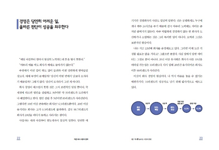 óÀ½ â¾÷À» ÇßÀ» ¶§ ´Ù¾çÇÑ °æÇèÀÌ ÀÖ¾ú±â¿¡ ȸ»ç°¡ ±Ý¹æ ¾ÈÁ¤µÉ ÁÙ ¾Ë¾Ò´Ù. ÇÏÁö¸¸ ¿¹±âÄ¡ ¸øÇß´ø »óȲµéÀÌ µ¿½Ã´Ù¹ßÀûÀ¸·Î ¹ß»ýÇß°í ¿¹Ãø´ë·Î µÇ´Â ÀÏÀÌ ¸¹Áö ¾Ê´Ù´Â »ç½ÇÀ» ±ú´Ý°Ô µÇ¾ú´Ù. ÀÌ Ã¥Àº ½ÇÁ¦ ½ºÅ¸Æ®¾÷ºÎÅÍ 20³â µ¿¾È ȸ»ç¸¦ °æ¿µÇؿ ´ëÇ¥°¡ ÀÚ½ÅÀÌ ½ÇÆÐÇÑ °æÇèÀ» ¹ÙÅÁÀ¸·Î ÇÑ Çö½ÇÀûÀÎ Á¶¾ð°ú ³ëÇϿ찡 °¡µæÇÏ´Ù.