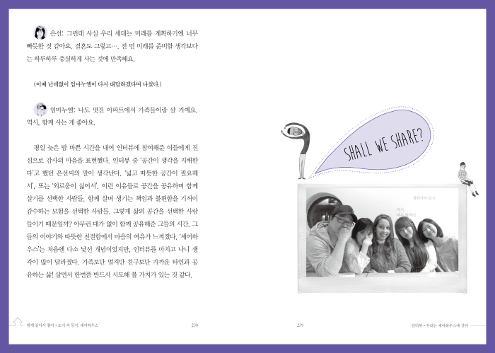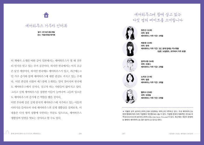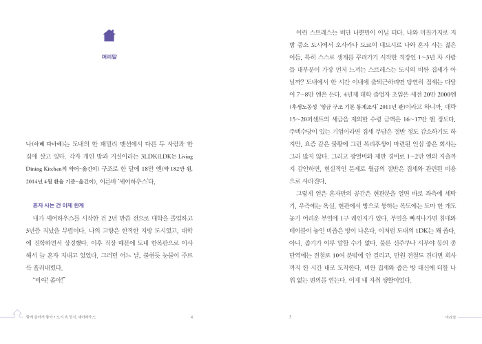 ´ëÇÐÀ» ÁøÇÐÇÏ¸é¼ »ó°æ ÈÄ È¸»ç µ¿±â·Î ¸¸³ µÎ »ç¶÷Àº Áö¹æÃâ½ÅÀÌ µµ½Ã¿¡¼ ¾ó¸¶³ª »ì±â ÈûµçÁö Åë°¨ÇÏ¸é¼ ¼Î¾î ÇϿ콺¸¦ ½ÃÀÛÇß´Ù. ¼Î¾î ÇϿ콺°¡ µµ½Ã¿¡¼ Ä¿¹Â´ÏƼ·Î °¡´É¼ºÀÌ ÀÖ´Ù´Â °É ´À³¢°í, ÀþÀºÀ̵éÀÌ µµ½Ã¿¡¼ ´õ Áñ°Ì°í »ì±â ½¬¿î ±¸Á¶¸¦ ¸ð»öÇϱ⠽ÃÀÛÇß´Ù. ÇöÀç, ÈÞÀÏ¿¡´Â ¡®¿©ÇàÀ» ÁÁ¾ÆÇÏ´Â »ç¶÷µé,¡¯ ¡®¸¸È¸¦ ÁÁ¾ÆÇÏ´Â »ç¶÷µé¡¯ µî Å׸¶º°·Î Ȩ ÆÄƼ¸¦ ±âȹÇϱ⵵ Çϰí, Ãë¾÷Áغñ»ýµé¿¡°Ô ¼Î¾î ÇϿ콺¸¦ ¹«»óÀ¸·Î Á¦°øÇÏ´Â µî »ç¶÷µéÀ» ¿¬°áÇÏ´Â ´Ù¾çÇÑ ½Ãµµ¸¦ Çϰí ÀÖ´Ù.