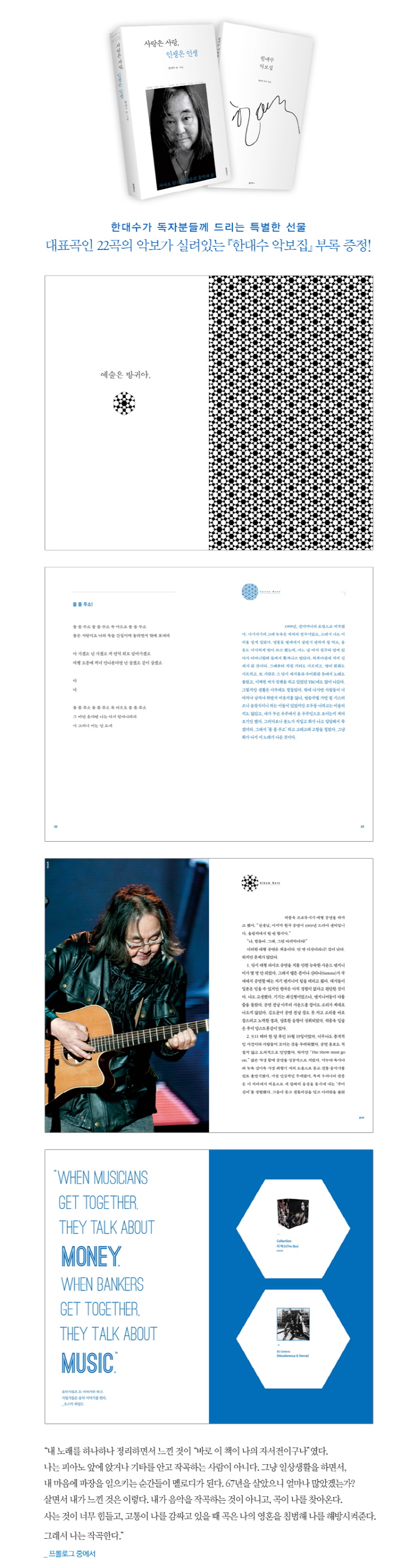 Çѱ¹ ÃÖÃÊÀÇ ½Ì¾î¼Û¶óÀÌÅÍÀÌÀÚ Çѱ¹ Æ÷Å©-¶ôÀÇ Àü¼³, ¹ÂÁö¼Ç ÇÑ´ë¼ö°¡ ÀÚ½ÅÀÌ ÀÛ»çÇÑ °îµéÀÇ °¡»ç¸¦ ¸ðµÎ ¸ðÀ¸°í, ÀÌµé °¡»ç°¡ Áö´Ñ Ưº°ÇÑ »ç¿¬À» ±Û·Î ½á¼ Ã¥À¸·Î Æì³Â´Ù. ±×°¡ ÂïÀº ¼ö¸¸ ÀåÀÇ »çÁø °¡¿îµ¥ °¡»ç¿¡ ¾î¿ï¸®´Â »çÁøµéÀ» »Ì¾Æ¼ ÇÔ²² ½ÇÀº °ÍÀÌ Æ¯Â¡ÀÌ´Ù. ¡®¹° Á» ÁÖ¼Ò!¡¯, ¡®ÇູÀÇ ³ª¶ó¡¯ µî ÁÖ¿ä ÀÛǰ 50¿© °î¿¡ ¾ôÈù »ç¿¬µéÀº ÇÑ´ë¼öÀÇ À½¾Ç Àλý 40³âÀ» °üÅëÇϸç Áö³ª°£´Ù. ½ÃÀûÀ̸鼵µ »çȸºñÆÇÀûÀÎ °¡»ç ¼Ó¿¡´Â ¾Æ¹öÁö¿Í ¾î¸Ó´ÏÀÇ ºÎÀç·Î ÀÎÇÑ »ó½Ç°¨, µ¶Àç Á¤±Ç ½ÃÀý ÀÚ½ÅÀÇ °îµéÀÌ ±ÝÁö°îÀÌ µÇ¾úÀ» ¶§ÀÇ Àý¸Á°¨, ù ¾Æ³»¿ÍÀÇ À̺° ÈÄ Ã£¾Æ¿Â °íµ¶, ´Ù½Ã ã¾Æ¿Â »ç¶ûÀÇ Áñ°Å¿ò, ¹ÌÄ£ ¼¼»óÀ» ÇâÇÑ ºÐ³ë, µþÀÌ Å¾À» ¶§ÀÇ ±â»Ý µîÀÌ ¿À·ÔÀÌ ³ì¾Æ ÀÖ´Ù. ºÎ·Ï ¡ºÇÑ´ë¼ö ¾Çº¸Áý¡»¿¡´Â ´ëÇ¥°î 22°îÀÇ ¾Çº¸°¡ ½Ç·Á ÀÖ´Ù.