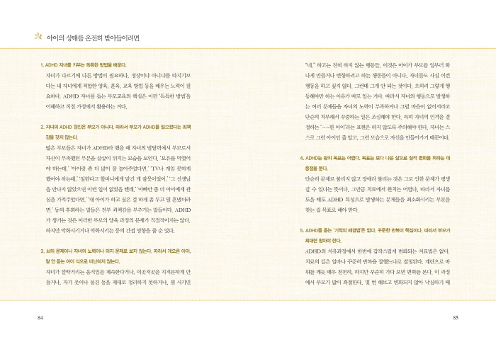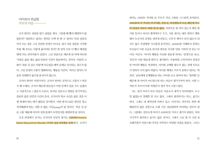 Ä¡·á¸¦ ³íÇÏ´Â ÀÚ¸®¿¡¼ ¸¸³ª´Â ºÎ¸ðµéÀº ¾îÂî º¸¸é ¾ÆÀ̺¸´Ù ´õ ¾ÆÇ »óÅ´Ù. ±×·± ºÎ¸ðµé¿¡°Ô ÈûÀÌ µÇ¾îÁÙ Çö½ÇÀûÀΠåÀÌ ÀÖ¾úÀ¸¸é Çߴµ¥, ÀÌ Ã¥ÀÌ ±× ´äÀÌ µÇ¾îÁÙ ¼ö ÀÖÀ» µíÇÏ´Ù. ADHD ºÎ¸ð¶ó´Â ±æÀ» °È´Â À̵éÀ» ÁøÁ¤À¸·Î ǰ¾îÁÖ°í °Ý·ÁÇØÁÖ·Á´Â ¸¶À½ÀÌ ´ã°Ü Àִ åÀÌ´Ù. ¶Ç ±×·± ºÎ¸ð¿Í ÇÔ²²ÇÏ´Â ÁÖº¯ÀÎ, Ä¡·á»ç, ±³»çµé¿¡°Ôµµ ¶Ç ´Ù¸¥ Çý¾ÈÀ» °®°Ô ÇÏ´Â ÈûÀ» °¡Áø Ã¥ÀÌ´Ù.