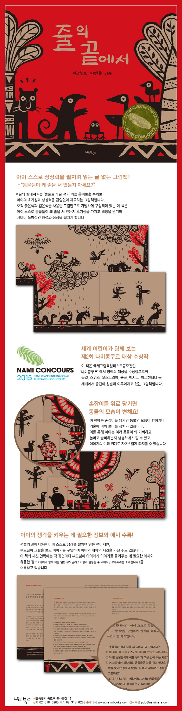 ¡ìÁÙÀÇ ³¡¿¡¼¡í´Â ¡®µ¿¹°µéÀÇ ÁÙ ¼±â¡¯¶ó´Â Èï¹Ì·Î¿î ÁÖÁ¦·Î ¾ÆÀÌÀÇ È£±â½É°ú »ó»ó·ÂÀ» ²÷ÀÓ¾øÀÌ ÀÚ±ØÇÏ´Â ±×¸²Ã¥ÀÔ´Ï´Ù. ¿ÀÁ÷ ºÓÀº»ö°ú °ËÀº»öÀ» »ç¿ëÇÑ ±×¸²¸¸À¸·Î ±â¹ßÇÏ°Ô ±¸¼ºµÇ¾î ÀÖ´Â ÀÌ Ã¥Àº ¾ÆÀÌ ½º½º·Î µ¿¹°µéÀÌ ¿Ö ÁÙÀ» ¼ ÀÖ´ÂÁö È£±â½ÉÀ» °¡Áö°í Ã¥ÀåÀ» ³Ñ±â¸ç Àú¸¶´Ù µ¶Ã¢ÀûÀÎ ÇØ¼®°ú »ó»óÀ» ÆîÄ¡°Ô ÇÕ´Ï´Ù.