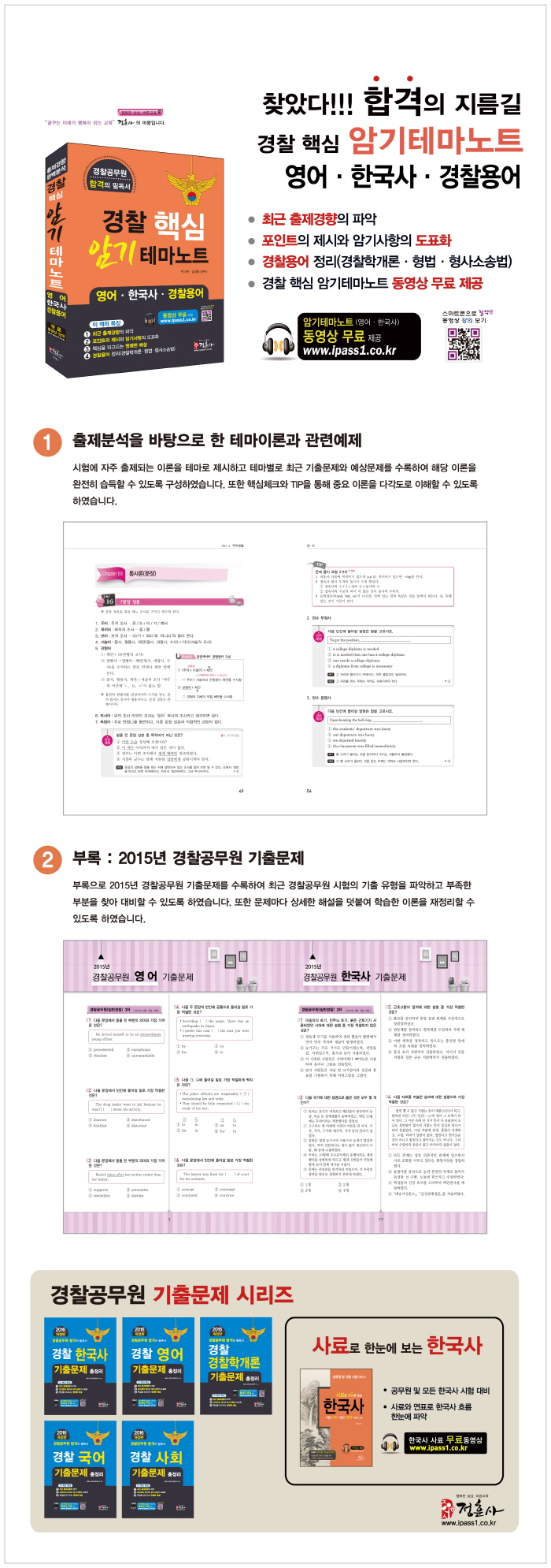 °æÂû°ø¹«¿ø ½ÃÇè¿¡ ÀÚÁÖ ÃâÁ¦µÇ´Â °ú¸ñº° ÇÙ½É ÀÌ·ÐÀ» Å׸¶·Î Á¦½ÃÇÏ¿© Áß¿ä Æ÷ÀÎÆ®¸¦ ÇÑ´«¿¡ È®ÀÎÇÒ ¼ö ÀÖµµ·Ï ÇÏ¿´´Ù. ¶ÇÇÑ Å׸¶ÁÖÁ¦¿¡ °ü·ÃµÈ °ü·Ã¿¹Á¦¿Í ÃÖ±Ù±âÃâ¹®Á¦¸¦ ¼ö·ÏÇÏ¿© ÇØ´ç ÀÌ·ÐÀ» üÈÇнÀÇÒ ¼ö ÀÖµµ·Ï ÇÏ´Â µ¿½Ã¿¡ °æÂû°ø¹«¿ø ½ÃÇèÁغñ¸¦ È¿À²ÀûÀ¸·Î °øºÎÇÒ ¼ö ÀÖµµ·Ï ³»¿ëÀ» ±¸¼ºÇÏ¿´´Ù. ºÎ·ÏÀ¸·Î´Â 2015³â ½ÃÇàµÈ °æÂû°ø¹«¿ø ¿µ¾î⋅Çѱ¹»ç ±âÃâ¹®Á¦¸¦ ¼ö·ÏÇÏ¿´´Ù. º»¼¸¦ °¡Áö°í Æò¼Ò¿¡ subnote³ª ¸·ÆÇÁ¤¸®¿ëÀ¸·Î Ȱ¿ëÇÑ´Ù¸é Å« È¿°ú¸¦ º¼ °ÍÀÌ´Ù. ±×¸®°í Á¤ÈÆ»ç ¾ÆÀÌÆÐ½º(http://www.ipass1.co.kr¿¡¼ µ¿¿µ»óÀ» ¹«·á·Î Á¦°øÇϹǷΠÀ̸¦ ÅëÇÏ¿© ÀÌÇØÀÇ ÆøÀ» ³ÐÈú ¼ö ÀÖÀ» °ÍÀÌ´Ù.