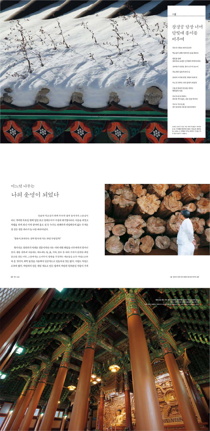 È£±¸ÁöÃ¥ÀÌ »îÀÇ ÃÖ¿ì¼± ôµµ¿´´ø ½ÃÀý, ¿À·ÎÁö ¸Ô°í»ì±â À§ÇØ ¸ñ¼ö°¡ µÈ ÀÌ·¡ ÇÏ·ç ³× ½Ã°£ ÀÌ»óÀ» ÀÚº» Àû ¾øÀÌ ¾Õ¸¸ º¸°í ´Þ·Á¿Â ¼¼¿ùÀÌ ¾î¾ð 55³âÀ» Èǽ ³Ñ¾ú´Ù. ¼¼¿ùÀÇ µÎ²²¸¸ÅÀ̳ª ±×ÀÇ ¾ó±¼°ú ¼Õ¹ß, ¾î±ú¿Í Ç㸮¿¡´Â Çè³Çß´ø ½Ã°£ÀÇ ÈçÀûµéÀÌ °í½º¶õÈ÷ ³²¾ÒÁö¸¸ ÇÑÆíÀ¸·Î ¼¼»óÀÌ ±×¿¡°Ô ºÎ¿©ÇÑ °æÀÇ¿Í Âù»ç ¶ÇÇÑ ¸¸¸¸Ä¡ ¾Ê°Ô ½×ÀÌ°Ô µÇ¾ú´Ù. ±¹°¡ ÁöÁ¤ Á߿乫Çü¹®ÈÀç Á¦ 74È£ÀÌÀÚ À¯³×½ºÄÚ Àηù¹«Çü¹®ÈÀ¯»êÀ¸·Î ÁöÁ¤µÈ ±×´Â ¸í½Ç°øÈ÷ ÀüÅë ÇÑ¿Á °ÇÃàÀÇ ÀÏÀÎÀÚÀÌÀÚ ´ëÇѹα¹ÀÇ º¸¹°·Î ÀÏÄþîÁø´Ù. Á¤ºÎ¿¡¼´Â Áö³ 2004³â ¿Á°ü¹®ÈÈÆÀå, 2010³â Àº°ü¹®ÈÈÆÀåÀ» ¼ö¿©ÇÔÀ¸·Î½á ±×ÀÇ ³ë°í¿Í °ø·Î¿¡ ¾Æ³¦¾ø´Â °¥Ã¤¸¦ º¸³Â´Ù. 1945³â Ãæ³² ¿¹»ê±º ´ö»ê¸é¿¡¼ ÅÂ¾î³ ±×ÀÇ ¸ñ¼ö ÀλýÀº ÃæÃ»µµ »ç¶÷´ä°Ô ´À¸®Áö¸¸ ¼¼È÷ °·ÄÇÑ ºûÀ» ¹ßÇÑ »îÀ̾ú´Ù. ±×ÀÇ ¼ÕÀ¸·Î °ÇÃàÇÑ ÇÑ¿ÁÀº ±¹Åä °÷°÷¿¡ »êÀçÇØ ÀÖ´Ù. õ³â°íÂû ¿µÁÖ ºÎ¼®»çÀÇ ¼³¹ý Àü°ú ȸ¶û, ¿ì¸®³ª¶ó¿¡¼ °¡Àå ¿À·¡µÈ ¸ñÁ¶ °Ç¹°·Î ±¹º¸ Á¦15È£ÀÎ ¾Èµ¿ ºÀÁ¤»ç ±Ø¶ôÀü, ÅëÀϽŶó½Ã´ë ¿ù¼º ³²ÂÊ ±Ã¼ºÀÇ Åë·Î¿´´ø ÁöºØÀ» ¾º¿î ¸ñÁ¶ ´Ù¸® ¿ùÁ¤±³, ³²µµ ´ä»ç ÀϹøÁö·Î ÀÏÄþîÁö´Â °Áø ´Ù»êÃÊ´çÀÇ µ¿¾Ï°ú ¼¾Ï, ¼øÃµ ¼Û±¤»ç À°°¨Á¤°ú ¾à»çÀü, ¿µ»êÀü, °î¼º žȻçÀÇ ¿ø°¢¼±¿ø°ú ¸í¼±¾Ï, °øÁÖ ¸¶°î»çÀÇ ÁßÃþ »çÂû ´ë¿õº¸Àü, ¿¹»ê ¼ö´ö»ç ÀÏÁÖ¹®, ¿À´ë»ê ¿ùÁ¤»çÀÇ Àû±¤Àü°ú ¹æ»ê±¼ ±×¸®°í 1,400³â Àü ¹éÁ¦ÀÇ °ÇÃà ¾ç½ÄÀÎ ÇÏ¾Ó½Ä ±â¹ýÀ¸·Î ´ç½ÃÀÇ ¹éÁ¦¸¦ ±×´ë·Î ÀçÇöÇØ³õÀº ºÎ¿© ¹éÁ¦¹®È´ÜÁö µîÀÌ ±×°¡ º¹¿øÇϰųª »õ·Î °ÇÃàÇÑ ÀÛǰµéÀÌ´Ù. ¾ÆÁ÷µµ Àü±¹À» ´©ºñ¸ç ¼··Â¼··ÇÑ ¸ñ¼Ò¸®·Î °ø»ç ÇöÀåÀ» Áö ÈÖÇÏ´Â ±×´Â °æ±âµµ ³²¾çÁÖ¿¡ Àü¼ö±³À°°üÀ» °Ç¸³ÇÏ¿© ÈÄÁø ¾ç¼º¿¡ ¸ÅÁøÇϰí ÀÖ´Ù.