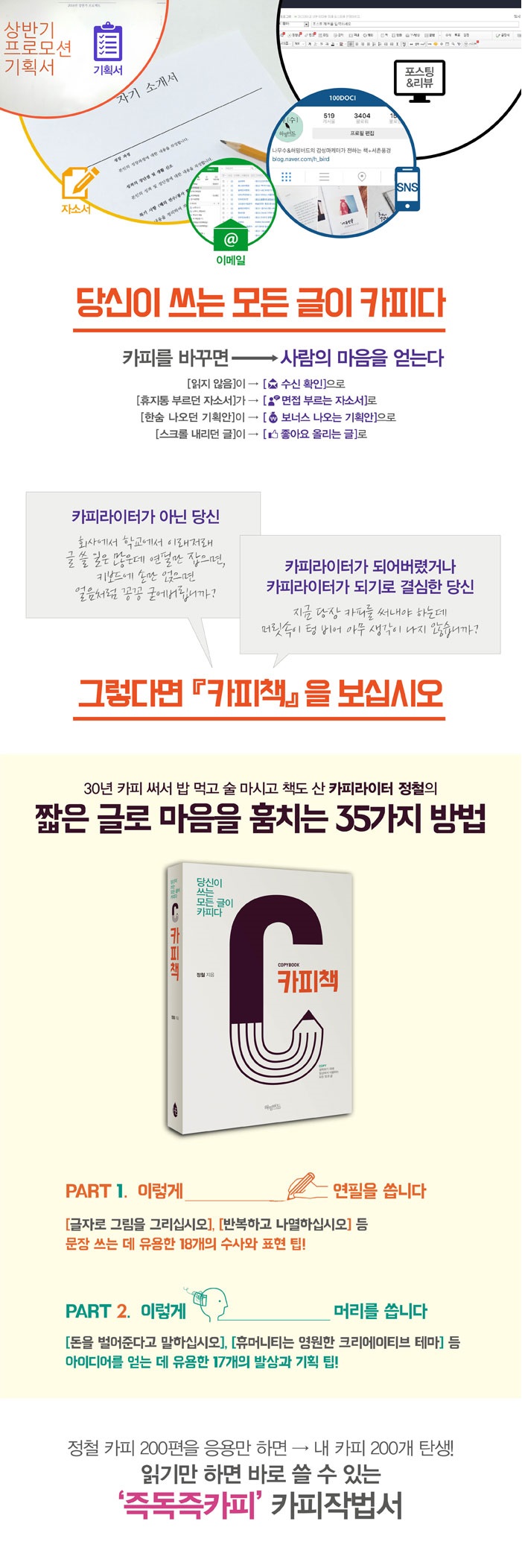 ³ª´Â Ä«ÇǶóÀÌÅͰ¡ µÉ °Ç ¾Æ´Ñµ¥ ÀÌ Ã¥ ÀÐÀ» Çʿ䰡 ÀÖÀ»±î? ¹¯´Â »ç¶÷µµ ºÐ¸í ÀÖÀ» °ÍÀÔ´Ï´Ù. Ä«ÇÇµç ¿¡¼¼ÀÌµç ¿¬¾ÖÆíÁöµç »ç¶÷ ¸¶À½À» ¿°í ½Í¾î ÇÑ´Ù´Â Á¡¿¡¼ ¸ðµç ±ÛÀº °°´Ù°í »ý°¢ÇÕ´Ï´Ù. Ä«ÇǶóÀÌÅͰ¡ ¾Æ´Ñ »ç¶÷Àº ªÀº ±Û·Î »ç¶÷ ¸¶À½À» ¾ò´Â ¹æ¹ýÀ̶ó´Â °üÁ¡ Çϳª¸¸ ºÙµé°í ÀоîÁÖ½Ã¸é µË´Ï´Ù. ¡ª p.12 ¡®PROLOGUE _ Ã¥ ÇÑ ±Ç¿¡ ²Ú²Ú ´·¯ ´ã¾Ò½À´Ï´Ù¡¯ Áß¿¡¼