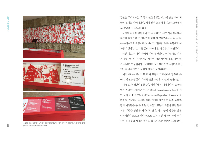 ¶Ç ÇϳªÀÇ Àå¸éÀº ¿ö½ÌÅÏ D.C.¿¡ À§Ä¡ÇÑ ¸µÄÁ ±â³ä°ü(Lincoln Memorial)ÀÇ ÀÛÀº È«º¸°üÀÌ´Ù. Àͼ÷ÇÑ ¸¶Æ¾ ·çÅÍ Å·(Martin Luther King, Jr.) ¸ñ»çÀÇ »çÁøµµ ´«¿¡ ¶ç¾ú´Ù. ¸µÄÁ ±â³ä°ü¿¡¼ ÀϾ´ø ´Ù¾çÇÑ »ç°ÇÀÇ »çÁøµé·Î º®¸éÀ» Àå½ÄÇß´Ù. ÈæÀÎ Àαǿ µîÀÇ ¸ð½ÀÀ» ´ãÀº »çÁøµéÀº ¡®ÀÚÀ¯ÀÇ ±ËÀû¡¯À¸·Î ºÒ·¯µµ ÁÁÀ» ¸¸Å ÀÚÀ¯¿Í ÀαÇÀÇ °¡Ä¡°¡ ¼¼±â¸¦ ³Ñ¾î À̾îÁ® ¿ÔÀ½À» º¸¿© ÁÖ°í ÀÖ¾ú´Ù. ±× ÀÚü°¡ ¼º°ø°ú ¼ºÃëÀÇ ±ËÀûÀº ¾Æ´Ò ¼ö ÀÖÀ¸³ª, Àú·¸°Ô ¡®¸é¸éÈ÷ È帣°í ÀÖ´Ù´Â »ç½Ç¡¯ÀÌ ¼º°ø°ú ¼ºÃ븦 ³»¼¼¿ì´Â °Íº¸´Ù ´õ ºÎ·¯¿ü´Ù. ±× ¶ÇÇÑ ¡®ÀÖ´Â ±×´ë·Î¡¯°¡ °¡Áö´Â ÀÇÀÇÀ̱⵵ Çϸ®¶ó.