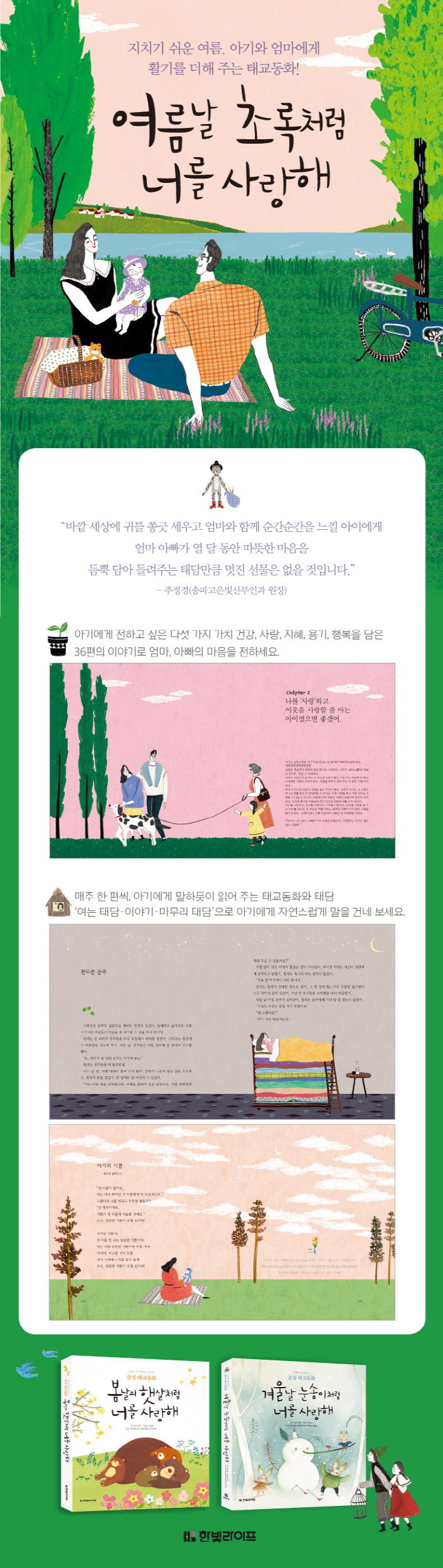 ¡¶¿©¸§³¯ ÃÊ·Ïó·³ ³Ê¸¦ »ç¶ûÇØ¡·´Â ÀÓ½ÅÀ» ¾Ë°Ô µÈ ¼ø°£ºÎÅÍ ¾ÆÀ̸¦ ³º´Â ³¯±îÁö, ¾Æºü°¡ ¾ÆÀÌ¿¡°Ô Å´ãÀ» µé·ÁÁÖµí ÀÚ¿¬½º·´°Ô Àоî ÁÙ ¼ö Àִ ű³µ¿ÈÃ¥ÀÌ´Ù. ¾Æ±â¸¦ °¡Áö¸é ¾ö¸¶, ¾Æºü´Â ¿ì¸® ¾ÆÀÌ¿¡°Ô À̰͸¸Àº ÀüÇØÁÖ°í ½Í´Ù, ÇÏ´Â °¡Ä¡¿¡ ´ëÇØ »ý°¢ÇÏ°Ô µÈ´Ù. ÀÌ Ã¥Àº ¾ÆÀÌ¿¡°Ô ²À ÀüÇÏ°í ½ÍÀº ´Ù¼¸ °¡Áö °¡Ä¡ – °Ç°, »ç¶û, ÁöÇý, ¿ë±â, Çູ°ú °ü·ÃµÈ 36ÆíÀÇ À̾߱⸦ ¸ð¾Ò´Ù. ¹à°í °Ç°ÇÑ ±â¿îÀ» ¾òÀ» ¼ö ÀÖ´Â À̾߱â¿Í °¨°¢ÀûÀÎ ±×¸²°ú ¾î¿ì·¯Áø À̾߱⸦ Àд٠º¸¸é ´õ¿î ¿©¸§ÀÇ ±â¿îÀº »ç¶óÁö°í, ¹è ¼ÓÀÇ ¾ÆÀÌ¿Í ±³°¨ÇÏ´Â ½ÅºñÇÑ °æÇèÀ» ÇÒ ¼ö ÀÖÀ» °ÍÀÌ´Ù.
