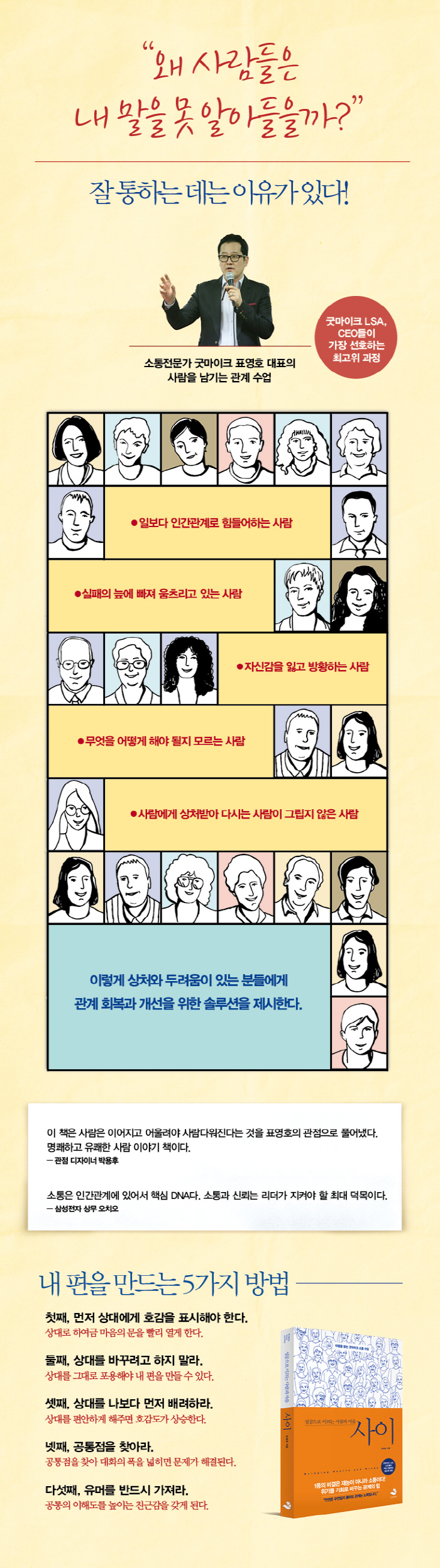 ÀÌ Ã¥Àº ¼º°ø°ú Àΰ£°ü°è, ³ª¾Æ°¡ »ç¶÷´ä°Ô »ç´Â µ¥ µµ¿òÀÌ µÇ´Â ¼ÒÅë ³ëÇϿ츦 Àü´ÞÇÑ´Ù. ÀúÀÚÀÎ ±Â¸¶ÀÌÅ© Ç¥¿µÈ£ ´ëÇ¥´Â ¼ÒÅëÀü¹®°¡·Î¼ ¿¬°£ 200ȸ ÀÌ»ó °¿¬ÇÏ¸ç ¸·Èû¾øÀÌ ¼ú¼ú Ç®¸®´Â ¼ÒÅëÀÇ ºñ°áÀ» ÀüÆÄÇÏ´Â µ¥ ¾ÕÀå¼°í ÀÖ´Ù. ¼ÒÅëµÇÁö ¾Ê¾Æ ½ÇÆÐÇÑ °æÇèÀ» °¡Áö°í ÀÖ´ø ÀúÀÚ´Â ¼º°ø°ú Çູ¿¡ ÀÖ¾î¼ °ü°èÀÇ Á߿伺À» ±ú´Ý°í ¼ÒÅëÀÇ ºñ°á¿¡ ÃµÂøÇØ, »ç¶÷°ú ¸¶À½ ¡®»çÀÌ¡¯¸¦ Ä£¹ÐÇÏ°Ô ÇØÁÖ´Â °ü°è¿¡ ´ëÇÑ ³¯Ä«·Î¿î ÅëÂûÀ» ÀÌ Ã¥¿¡ ´ã¾Ò´Ù.