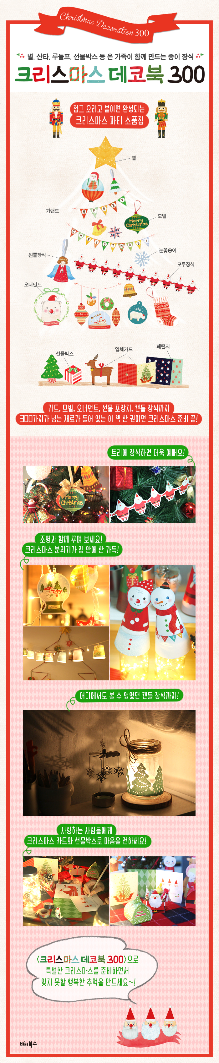 <Å©¸®½º¸¶½º µ¥ÄÚºÏ 300>Àº Áý, »ç¹«½Ç µî¿¡ Å©¸®½º¸¶½º Àå½ÄÀ» ÇÒ ¼ö ÀÖ´Â Á¾ÀÌ ¼ÒǰÀ» ¸¸µå´Â Ã¥ÀÌ´Ù. ´Ù¾çÇÑ ±×¸²ÀÇ Á¾ÀÌ Àç·á¸¦ ¿À¸®°í ºÙÀÌ¸é »êŸŬ·Î½º, ´«»ç¶÷, ·çµ¹ÇÁ, ÄíŰ ÀÎÇüÀÌ ¸ðºô°ú ¿À³Ê¸ÕÆ®°¡ µÇ°í, ´Ù¾çÇÑ ÆÐÅÏÀÇ ´«²É¼ÛÀÌ¿Í ´çÀåÀÌ¶óµµ ÆíÁö¸¦ ¾²°í ½Í°Ô ÇÏ´Â ÀÔü Ä«µå°¡ ¶Òµü ¸¸µé¾îÁø´Ù. ¸¸µå´Â ¹ýµµ ½±°í °£´ÜÇÏ¿© °¡À§¿Í Ç®¸¸ ÀÖÀ¸¸é ¼ÕÀçÁÖ°¡ ¾ø´Â ¾ö¸¶ ¾Æºüµµ, ¸¸µé±â¿¡ ¼Å÷ ¾ÆÀ̵鵵 ¿¹»Û ³ª¸¸ÀÇ Å©¸®½º¸¶½º Àå½ÄÀ» ¸¸µé ¼ö ÀÖ´Ù.
