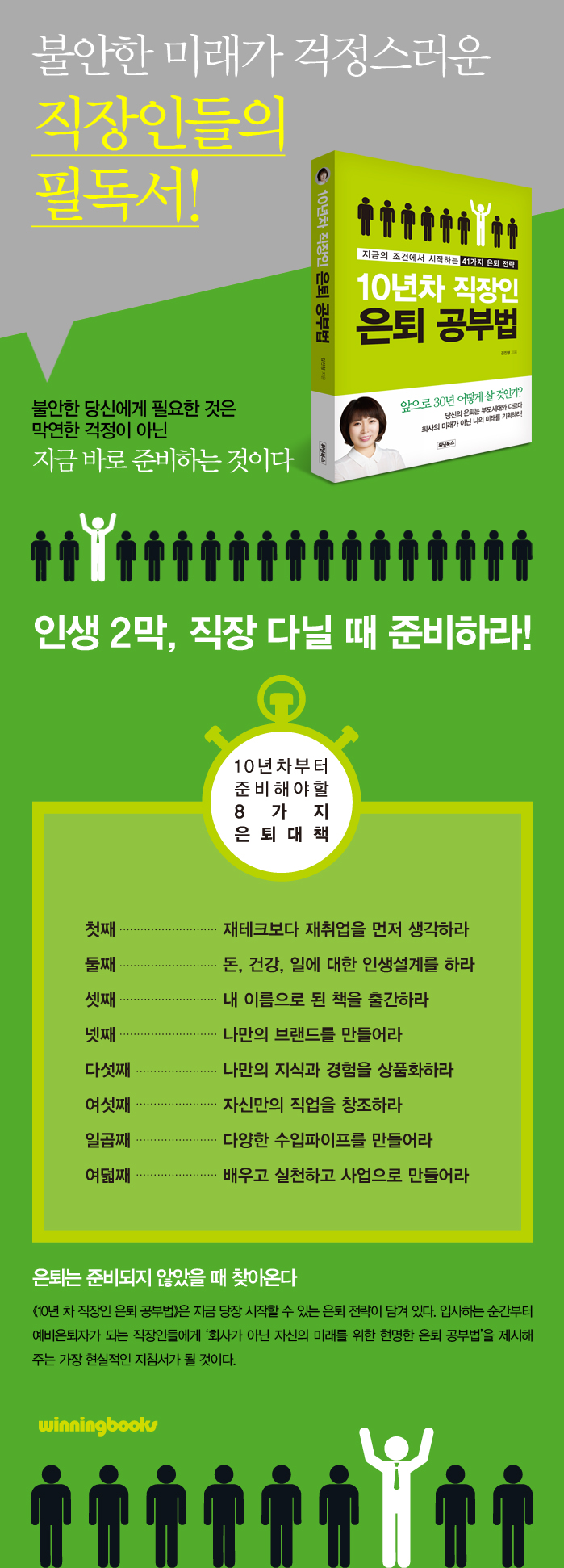¸¹Àº »ç¶÷µéÀÌ Á÷Àå»ýȰÀ» ÇÏÁö¸¸ ¹Ì·¡¿¡ ´ëÇÑ ºÒ¾ÈÀ¸·Î °í¹ÎÀ» ¾È°í »ê´Ù. ÀúÀÚ´Â ±×µé¿¡°Ô »î°ú ÀÏÀÇ Á¶È¸¦ ¸¸µé¾î °¡¸ç ¾òÀº ±ú´ÞÀ½À» ÀüÇØ ÁÖ°íÀÚ ÀÌ Ã¥À» ¾²±â ½ÃÀÛÇß´Ù. ÇöÀç´Â ÀºÅðÄÚĪ¿¬±¸¼Ò¸¦ ¸¸µé¾î ´õ ¸¹Àº »ç¶÷µéÀÇ °í¹ÎÀ» ÇØ°áÇØ ÁÖ°í »õ·Î¿î ¹Ì·¡¸¦ ¼³°èÇÏ´Â µ¥ µµ¿òÀ» ÁÖ°íÀÚ ³ë·ÂÇϰí ÀÖ´Ù.
