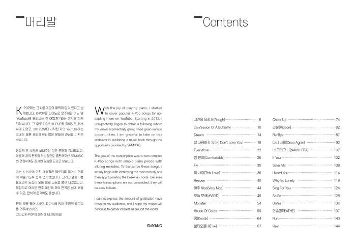 ÀúÀÚ SMYANGÀº ij³ª´Ù¿¡ °ÅÁÖÇÏ´Â ÇÇ¾Æ³ë ¿¬ÁֺоßÀÇ À¯Æ©¹ö·Î ÇØ¿Ü K-POPÆÒµé¿¡°Ô´Â ¿À·¡ÀüºÎÅÍ K-POP ÇÇ¾Æ³ë ¿¬ÁÖ·Î Àß ¾Ë·ÁÁ® ÀÖ´Ù. 2012³â 3¿ùºÎÅÍ ²ÙÁØÈ÷ K-POPÀ» ÇÇ¾Æ³ë ¼Ö·Î°îÀ¸·Î Ä¿¹öÇØ ¾÷·ÎµåÇϰí ÀÖ´Ù. 1ÁÖÀÏ¿¡ 1°î ÀÌ»ó ¾÷·ÎµåÇÏ´Â ²ÙÁØÇÔ°ú ¿ø°îÀ» Àß »ì¸° Æí°î, ¸Å·ÂÀûÀÎ ¿¬ÁÖ·Î 2016³â 12¿ùÀ» ±âÁØÀ¸·Î ±¸µ¶ÀÚ 22¸¸¸í, ´©Àû Á¶È¸¼ö 2,600¸¸¿¡ ´ÞÇÏ´Â Àα⸦ ÀÚ¶ûÇϰí` ÀÖ´Ù. À¯Æ©ºê¿¡¼ SMYANGÀ¸·Î °Ë»öÇϸé ÀúÀÚÀÇ ¿¬ÁÖµ¿¿µ»óÀ» ¾ðÁ¦µçÁö Áñ±æ ¼ö ÀÖ´Ù.