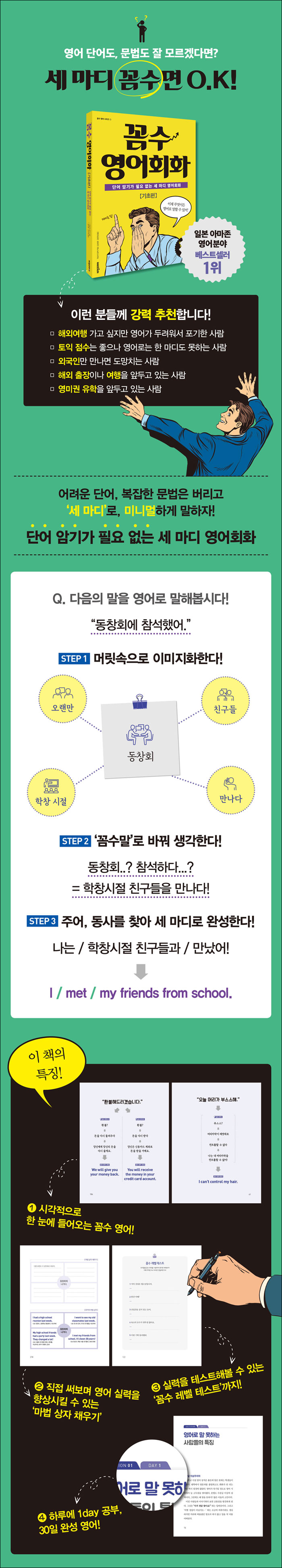 ¿µ¾î¸¦ ÀßÇÏ°í ½Í¾úÀ¸³ª ´Ü¾î¿Í ¹®¹ý¿¡ ¸·Çô ¡®³ª´Â ¾È µÈ´Ù¡¯´Â ÄÞÇ÷º½º¸¦ ¡®»ý°¢ÀÇ Àüȯ¡¯À¸·Î ±Øº¹ÇÑ °æÇèÀ» ¹ÙÅÁÀ¸·Î µ¶ÀÚÀûÀÎ ¡®²Ä¼ö ¿µ¾îȸȹý¡¯À» °³¹ßÇß´Ù. °íµîÇб³ ¶§ ¿µ±¹À¸·Î À¯ÇÐ °¡¼ À¯Ã¢ÇÑ ¿µ¾î¸¦ ÇØ¾ß ÇÑ´Ù´Â ¾Ð¹ÚÀ¸·Î ¸»µµ ¾È µÇ´Â ¿µ¾î¸¦ ±¸»ç, Ä£±¸µéÀ» ´çȲ½ÃŰ°Ô ÇÑ °æÇè ÀÌÈÄ ¿µ¾îÈ¸È °í¼öµéÀ» ºÐ¼®ÇÏ¿© ¡®¿µ¾î´Â ²Ä¼ö¸¦ ºÎ·Á¾ß ¸»ÇÒ ¼ö ÀÖ´Ù¡¯´Â °øÅëÁ¡À» ¹ß°ßÇÏ°Ô µÈ´Ù. À̸¦ Åä´ë·Î ¿µ¾î ÇнÀ ¿¬±¸¿¡ ¶Ù¾îµé¾î ´Ù¼öÀÇ ±â¾÷ ¿¬¼ö¿Í °¿¬À» ÅëÇØ ´Ü 2½Ã°£ ¸¸¿¡ ¿µ¾î ÄÞÇ÷º½º¸¦ ±Øº¹ÇÏ°Ô ÇÏ°í ¿µ¾î ¸øÇÏ´ø ÀϺ»ÀεéÀÇ ¸»¹®ÀÌ Æ®ÀÌ°Ô ÇÏ¿© Å« À̽´°¡ µÇ¾ú´Ù.