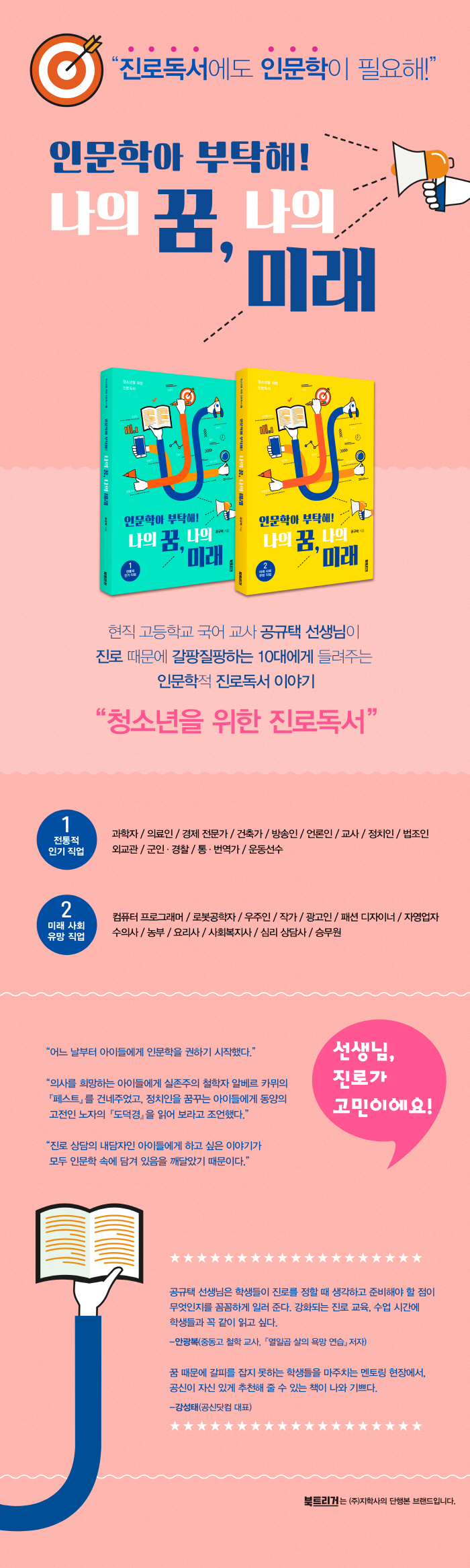 ¡ºÀι®ÇоÆ, ºÎÅ¹ÇØ! ³ªÀÇ ²Þ ³ªÀÇ ¹Ì·¡: û¼Ò³âÀ» À§ÇÑ Áø·Îµ¶¼¡»´Â Àι®ÇÐÀû Ã¥ Àб⸦ ¹ÙÅÁÀ¸·Î, ÀÚ±â ÁÖµµÀûÀÎ Áø·Î Ž»öÀÇ ¹æ¹ýÀ» ¾È³»ÇÏ´Â Áø·Îµ¶¼ Áöħ¼ÀÌ´Ù. 2015³â ¡¶°í±³µ¶¼Æò¼³¡·ÀÇ Áø·Îµ¶¼ Äڳʿ¡ ¿¬ÀçÇß´ø ±ÛÀ» °¥¹«¸®ÇÏ°í »õ·Ó°Ô ´Ùµë¾î¼ ¿«Àº Ã¥ÀÌ´Ù. ÇöÁ÷ ±¹¾î ±³»çÀÎ ÀúÀÚ´Â ¡®»ó´ã ÆíÁö¡¯¶ó´Â Çü½ÄÀ» ºô·Á, Áø·Î »ó´ãÀÇ ³»´ãÀÚÀÎ ÇлýµéÀÌ ²À ÀÐ¾î º¸¾ÒÀ¸¸é Çϴ åÀ» ÃßõÇÑ´Ù. ÀúÀÚ°¡ ¼Ò°³Çϴ åÀº °ü·Ã Á÷Á¾¿¡ °üÇÑ À¯¿ëÇÑ Á¤º¸¸¦ ´ã°í ÀÖÀ½Àº ¹°·Ð, °¢°¢ÀÇ Á÷¾÷¿¡ Á¾»çÇÒ »ç¶÷À̶ó¸é ¸¶¶¥È÷ °í¹ÎÇØ ºÁ¾ß Çϴ öÇÐÀû °í¹Î, Á÷¾÷ÀÎÀ¸·Î¼ ºÎµúÈ÷´Â ½ÇÁúÀûÀÎ ¹®Á¦ µî Æø³ÐÀº »ý°¢°Å¸®¸¦ Á¦°øÇÑ´Ù.