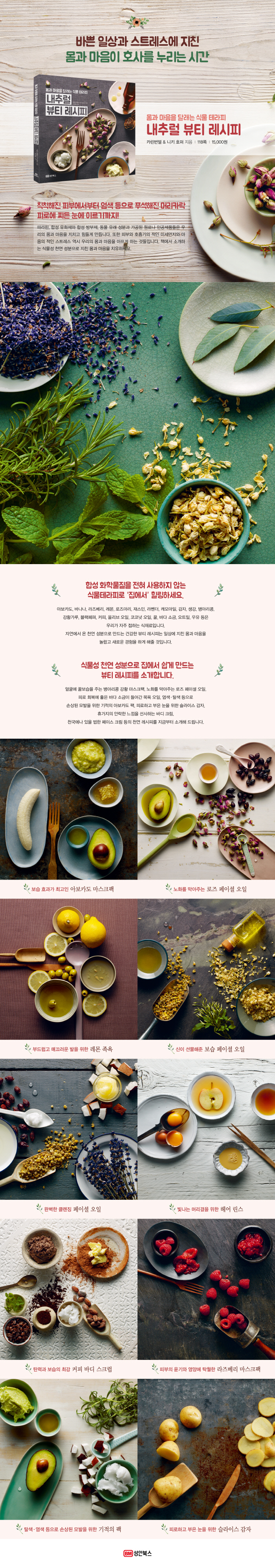 ÇǺδ ¿ì¸®ÀÇ ½Åü Áß °¡Àå Å« Àå±â·Î, ÁÁÀº ¼ººÐÀÌµç ³ª»Û ¼ººÐÀÌµç ¿ì¸®°¡ ¹Ù¸£´Â ¸ðµç °ÍÀ» ±×´ë·Î Èí¼öÇÕ´Ï´Ù. À̰ÍÀÌ ¿ì¸®°¡ ½Ä¹°¼º õ¿¬ ¼ººÐÀ¸·Î µÈ Á¦Ç°À» »ç¿ëÇØ¾ß ÇÏ´Â Áß¿äÇÑ ÀÌÀ¯ÀÔ´Ï´Ù. »ç¶÷Àº ÀÚ¿¬ÀÇ ÀϺÎÀ̰í, »ý¸íÀÇ ±Ù¿øÀÎ ÀÚ¿¬ÀÇ Á߽ɿ¡´Â ³ì»ö½Ä¹°ÀÌ ÀÖ½À´Ï´Ù. ³ì»ö½Ä¹°Àº ¿ì¸®¿¡°Ô À½½ÄÀÌÀÚ ÈÀåǰÀÇ ¿ø·áÀ̸ç, ¸öÀÌ ¾ÆÇà ¶§ Ä¡·á¸¦ À§ÇÑ ÀǾàǰÀ¸·Î ¾²À̱⵵ ÇÕ´Ï´Ù. ÀÌ Ã¥ ¡º¸ö°ú ¸¶À½À» ´Þ·¡´Â ½Ä¹° Å×¶óÇÇ, ³»Ãß·² ºäƼ ·¹½ÃÇÇ¡»¿¡´Â ÇÕ¼º ÈÇй°ÁúÀ» ÀüÇô »ç¿ëÇÏÁö ¾Ê°í õ¿¬ ¼ººÐÀ¸·Î Áý¿¡¼ ½±°Ô ¸¸µå´Â ºäƼ ·¹½ÃÇǸ¦ À¯¿ëÇϰí Àç¹ÌÀÖ°Ô ¼Ò°³Çϰí ÀÖ½À´Ï´Ù. ¾ó±¼¿¡ ²Üº¸½ÀÀ» ÁÖ´Â º´¾Æ¸®Äá °È² ¸¶½ºÅ©ÆÑ, ³ëȸ¦ ¸·¾ÆÁÖ´Â ·ÎÁî ÆäÀÌ¼È ¿ÀÀÏ, ÇÇ·Î ÇØ¼Ò¿¡ ÁÁÀº ¹Ù´Ù ¼Ò±ÝÀÌ µé¾î°£ ¸ñ¿å ¿ÀÀÏ, ¿°»ö¡¤Å»»ö µîÀ¸·Î ¼Õ»óµÈ ¸ð¹ßÀ» À§ÇÑ ±âÀûÀÇ ¾Æº¸Ä«µµ ÆÑ, ÇÇ·ÎÇÏ°í ºÎÀº ´«À» À§ÇÑ ½½¶óÀ̽º °¨ÀÚ, ÈÞ°¡ÁöÀÇ ¾È¶ôÇÑ ´À³¦À» ¼±»çÇÏ´Â ¹Ùµð Å©¸², õ±¹¿¡³ª ÀÖÀ» ¹ýÇÑ ÆäÀ̽º Å©¸² µîÀÇ Ãµ¿¬ ºäƼ ·¹½ÃÇÇ´Â ¹Ù»Û ÀÏ»ó°ú ½ºÆ®·¹½º·Î ÁöÄ£ ¿ì¸®ÀÇ ¸ö°ú ¸¶À½¿¡ ³î¶ø°í »õ·Î¿î °æÇèÀ» ÇÏ°Ô ÇØ ÁÙ °ÍÀÔ´Ï´Ù.