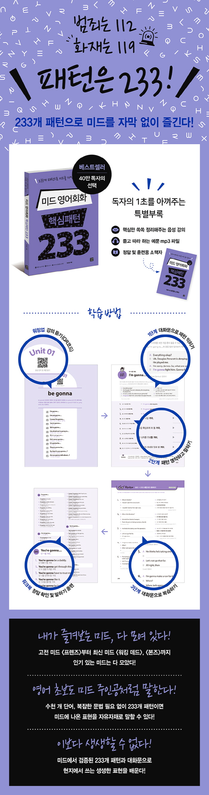 ¹ÌµåÀÇ °íÀüÀ̶ó ºÒ¸®´Â <ÇÁ·»Áî>, <»çÀÎÇʵå>ºÎÅÍ ¸Å ½ÃÁ𠺯ÇÔ¾øÀÌ »ç¶û¹Þ´Â <¹ÌÇØ±º¹üÁ˼ö»ç´ë>, <Å©¸®¹Ì³Î ¸¶Àεå>,¡´¸ð´ø ÆÐ¹Ð¸®>, <¿öÅ· µ¥µå>, ÃֽŠ¹Ìµå <µð½º ÀÌÁî ¾î½º>, <¸®½ä ¿þÆù>, <ºñ¿æµå>±îÁö ½Ã´ë¿Í À帣¸¦ ¾Æ¿ì¸£´Â ´Ù¾çÇÑ ¹Ìµå¿¡¼ ÆÐÅÏÀ» »Ì°í ´ëȹ®À» ¹ßÃéÇß´Ù. ´Ü¾î¿Í ¹®¹ý »ý°¢ÇÒ ÇÊ¿ä ¾øÀÌ 233°³ ÆÐÅÏ¿¡ ´Ü¾î¸¸ °¥¾Æ ³¢¿ì¸é ¿µ¾î Ãʺ¸ÀÚµµ ¹Ìµå ÁÖÀΰøÃ³·³ ¼¼·ÃµÈ Ç¥ÇöÀ» ±¸»çÇÒ ¼ö ÀÖ´Ù.