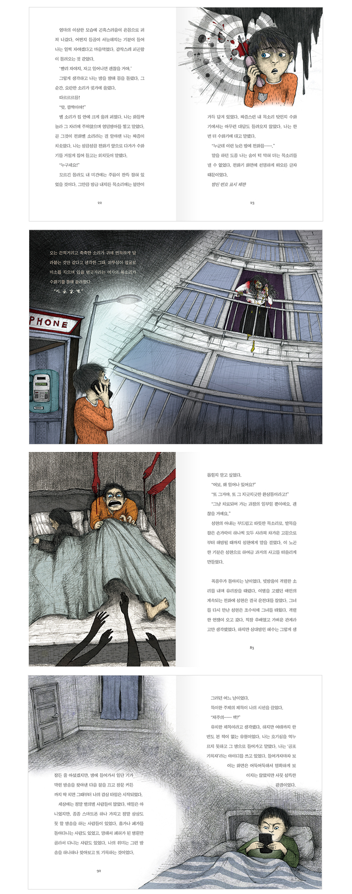 ³ª¿Í´Â ÀüÇô »ó°ü¾ø´Â ¼¼°èÀÇ À̾߱⠰°Áö¸¸ »ç½Ç °øÆ÷´Â ¿ì¸® °¡±îÀÌ¿¡ ÀÖ´Ù. Çб³Æø·ÂÀÇ ÇÇÇØÀÚ°¡ °¡ÇØÀÚ¸¦ ÇâÇØ ³»´øÁö´Â ³¯ÀÌ ¼± º¹¼ö, Å𸶻çÀÇ ½ÅºÐÀ» °¨Ãß°í ¹ã¸¶´Ù ¾Ç·É°ú ½Î¿ì´Â ±³»ç, ½ÖµÕÀÌ ÇüÁ¦°£ÀÇ ÁúÅõ¿¡¼ ºñ·ÔµÈ ²ûÂïÇÑ »ç°í, ½º¸¶Æ®Æù¿¡ Áßµ¶µÈ ³ª¸ÓÁö Á¡Á¡ ¸ÛûÇϰí ÀÜÀÎÇÑ Á»ºñ°¡ µÇ¾î °¡´Â ÀηùÀÇ ¸ð½À µî, ¡¶±«´ã ½ºÄð¡· ½Ã¸®Áî´Â ÁÖº¯ÀÇ »ç¹°, Æò¹üÇÑ ÀÏ»ó ¼Ó ±í¼÷ÀÌ µå¸®¿öÁø ¾µ¾µÇÏ°í ±â¹¦ÇÑ °øÆ÷ ¼¼°è¸¦ »õ·Ó°í âÀÇÀûÀÎ ½Ã¼±À¸·Î Æ÷ÂøÇÏ¿© ¼¼½ÉÇÏ°Ô ÆîÃÄ ³õ¾Ò´Ù. ¾ÆÀ̵éÀÌ Àϻ󿡼 ´À³¢´Â °øÆ÷¿¡ °ø°¨ÇÏ¸é¼ ÀÌ Ã¥À» Àç¹ÌÀÖ°Ô Áñ±æ ¼ö ÀÖ´Â ÀÌÀ¯À̱⵵ ÇÏ´Ù.