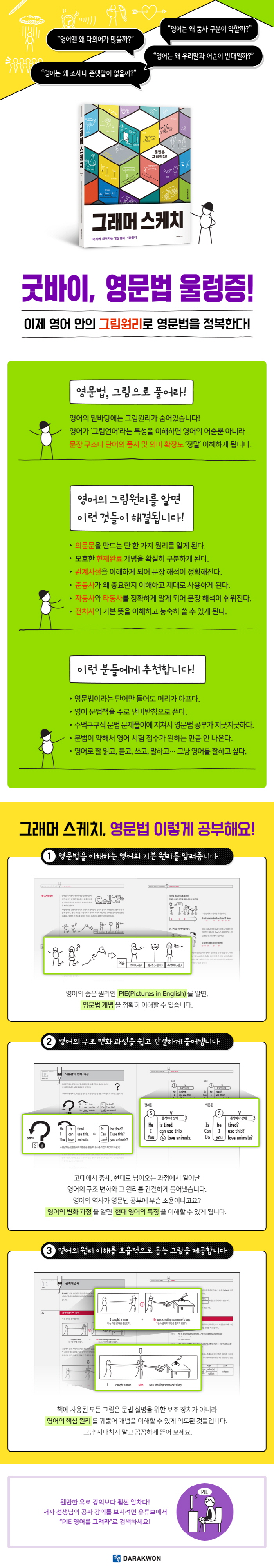½Éµ¿È´Â 14³â° ¿µ¾î¸¦ °¡¸£Ä¡°í ÀÖ´Â ¿µ¹®¹ý Àü¹®°¡. ¿µ¾î Æ÷±âÀÚ, ƯÈ÷ ¿µ¹®¹ý Æ÷±âÀڵ鿡°Ô ¾î¶»°Ô ¿µ¾î¸¦ Àç¹ÌÀÖ°Ô °¡¸£Ä¥ ¼ö ÀÖÀ»±î °í¹ÎÇÏ¸é¼ ÁÁÀº ¿µ¹®¹ý ±³À縦 ±¸Çϱâ À§ÇØ ³ë·ÂÇØ¿Ô´ø ±×´Â, °á±¹ ¸¶¶¥ÇÑ Ã¥À» ãÁö ¸øÇϰí Á÷Á¢ ¡®Á¤¸» µµ¿ò µÇ´Â ¹®¹ýÃ¥À» µé¾î¾ß°Ú´Ù!¡¯°í °á½É, ÀÌ Ã¥À» ¾²°í ±×¸®°Ô µÇ¾ú´Ù. ÀÌ Ã¥¿¡´Â °í´ë¿¡¼ Áß¼¼¿¡ °ÉÃÄ Çö´ë±îÁö ÀÏ¾î³ ¿µ¾î º¯È °úÁ¤¿¡ ´ëÇÑ ÀڷḦ Æ÷ÇÔÇÏ¿©, ¿µ¾îÀÇ ¿ª»ç¿¡ °üÇÑ ¼ö¸¹Àº ³í¹®°ú ¼ÀûÀÇ ¿¢±â½º°¡ PIE(Pictures in English), Áï ¡®¿µ¾î ¾ÈÀÇ ±×¸²¿ø¸®¡¯¶ó´Â À̸§À¸·Î ³ì¾Æ ÀÖ´Ù. ´Â À¯Æ©ºê µ¿¿µ»ó °ÀǸ¦ ÅëÇØ ÇнÀÀÚ¿Í Á÷Á¢ ¼ÒÅëÇϰíÀÚ ³ë·ÂÇÏ´Â ÇÑÆí, ²ÙÁØÈ÷ ¿µ¹®¹ýÀ» ¿¬±¸ÇÏ¸ç ¿µ¾îÀÇ º»ÁúÀû °³³äÀ» ´õ ½±°Ô Ç®¾î³¾ ¼ö ÀÖ´Â ¹æ¹ýÀ» °í¹ÎÇϰí ÀÖ´Ù.