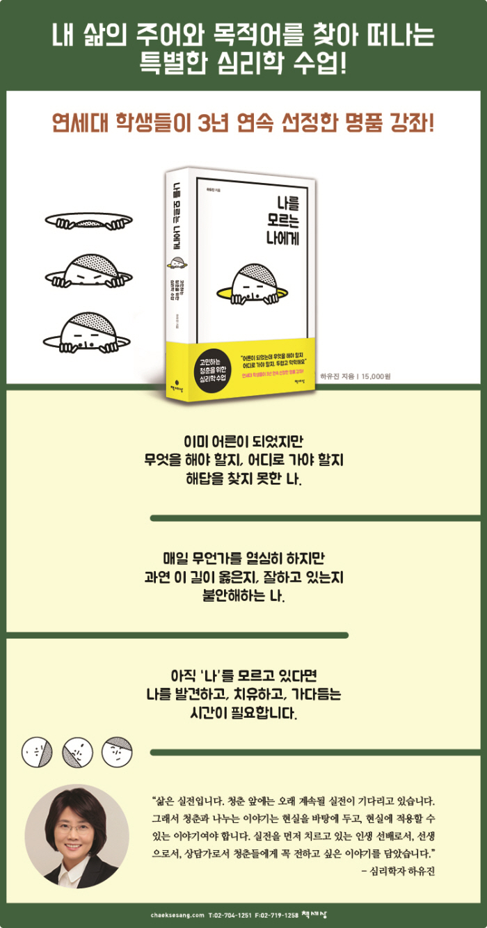 ÀÌ Ã¥Àº ÀÚ½ÅÀÇ Á¤Ã¼¼º°ú Áø·Î¸¦ °í¹ÎÇÏ´Â ´ëÇѹα¹ û³âµé¿¡°Ô ±×µé¸¸À» À§ÇÑ ½É¸®ÇÐ ¼ö¾÷À» Á¦¾ÈÇÑ´Ù. ÀԽÿ¡¼ ¹þ¾î³ª ÀÚÀ¯·Î¿î ¼ºÀÎÀÌ µÇ¾úÁö¸¸ Á¤ÀÛ ¹«¾ùÀ» ÇØ¾ß ÇÒÁö, ¾îµð·Î °¡¾ß ÇÒÁö, Àڱ⸸ÀÇ Áú¹®°ú ´äÀ» °®Áö ¸øÇØ µÎ·Á¿òÀ» ´À³¢´Â ûÃáµé¿¡°Ô ¡®ÀÚ±â¹ß°ß, ÀÚ±âÄ¡À¯, ÀÚ±â½ÇÇ࡯ÀÇ 3´Ü°è·Î ÀÌ·ïÁø ÀÚ±â½ÇÇöÀÇ ÁøÀԷθ¦ ¾Ë·ÁÁØ´Ù. - MD Ãßõ