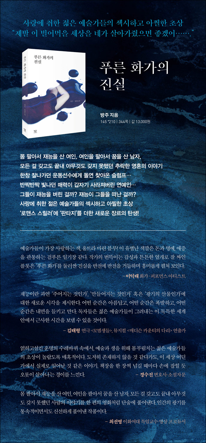 ÀÌÀÍÅ (Ȱ¡¡¤ÆÛÆ÷¸Õ½º ¾ÆÆ¼½ºÆ®) : ¿¹¼ú°¡µéÀÌ °¡Àå »ç¶ûÇÏ´Â »ö, ¿ïÆ®¶ó ¸¶¸° ºí·ç! ÀÌ À¯º°³ »ö±òÀº µ·°ú ¸í¿¹, ¾ÖÁõ À» °üÅëÇÏ´Â °ËǪ¸¥ ÀϱâÀå °°´Ù. ÀÛ°¡ÀÇ ¹ø¶àÀÌ´Â °¨¼º°ú ưưÇÑ ¾ó°³·Î Àß Â¥ÀÎ Çà ·ÔÀº ¡®Çª¸¥ Ȱ¡¡¯¸¦ µÑ·¯½Ñ Áø½ÇÀ» ¹ÝÀü¿¡ ¹ÝÀüÀ» °ÅµìÇϸç Èï¹Ì·Ó°Ô ÆîÃÄ º¸ÀδÙ.
