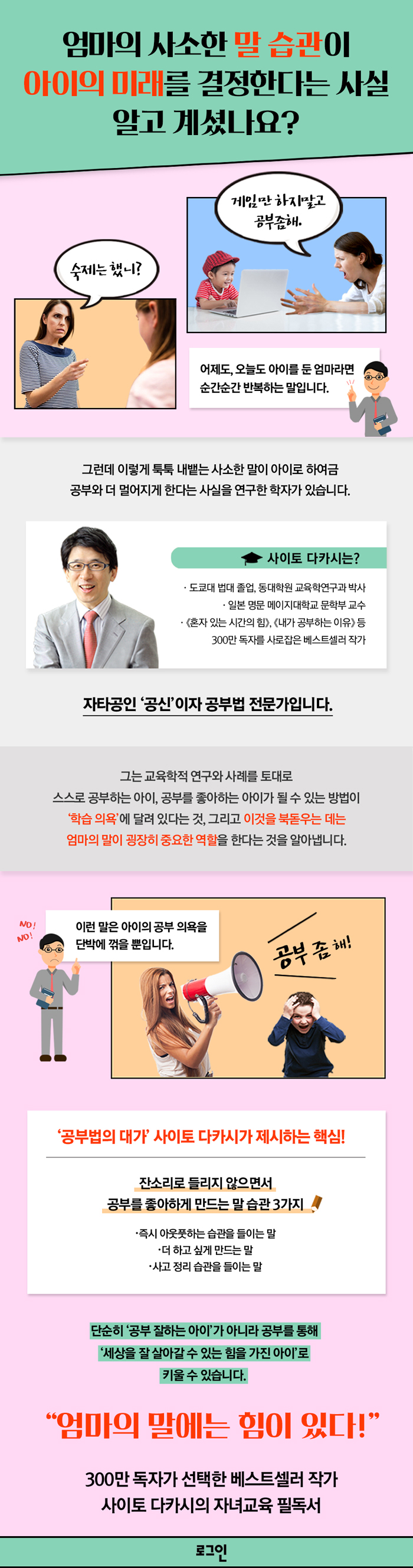 ¡°°øºÎ Á» ÇØ!¡±¿Í °°Àº ¸»·Î ¾ÆÀÌÀÇ ÇнÀ ÀÇ¿åÀ» ´Ü¹Û¿¡ ²ª°í ÀÖÁö ¾Ê¾Ò´ÂÁö Á¡°ËÇØ º¸ÀÚ. ÀúÀÚ´Â ¾ÆÀÌÀÇ ÇнÀ ÀÇ¿åÀ» ²ø¾î³»´Â ¼¼ °¡Áö ÇÙ½É ¸»»Ó ¾Æ´Ï¶ó, ºÎ¸ð¿Í ÀÚ³à »çÀÌ¿¡ Ä¿¹Â´ÏÄÉÀÌ¼Ç ¹Ðµµ¸¦ ³ôÀÌ´Â ¸»µµ ÇÔ²² Á¦½ÃÇÑ´Ù. ÀüºÎ ½ÇõÇÏ·Á°í ¹«¸®ÇÒ ÇÊ¿ä´Â ¾ø´Ù. ¹«½ÉÄÚ ³»¹ñ´Â ¸» ÇÑ ¸¶µð¿¡ Á¶±Ý¸¸ À¯ÀÇÇÏ´Â °ÍÀ¸·Î ÃæºÐÇÏ´Ù. ´Ü 3¹®ÀåÀ¸·Î ½º½º·Î ¾Ë¾Æ¼ °øºÎÇÏ´Â ¾ÆÀÌ, °øºÎ¸¦ ÁÁ¾ÆÇÏ´Â ¾ÆÀ̷ΠŰ¿ì¸é¼ ºÎ¸ð¿Í ÀÚ³à °£¿¡ µ·µ¶ÇÑ °ü°è¸¦ ¸¸µé ¼ö ÀÖ´Ù. ÃʵîÇлýÀ» À§ÇÑ °ø½Å ºñ¹ýÀ» ÀÌ Ã¥¿¡¼ ¸¸³ª º¸ÀÚ.