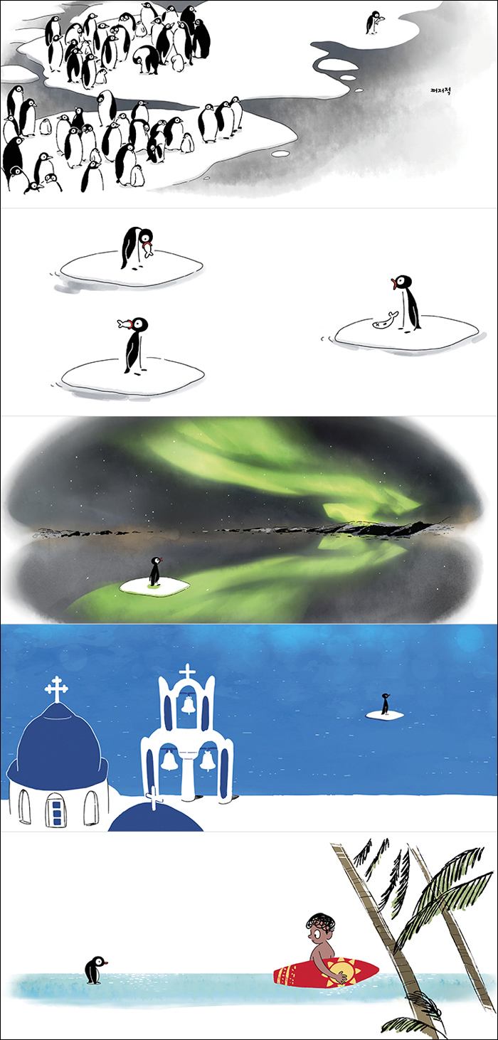 ´«°ú ¾óÀ½ÀÇ ³ª¶ó ³²±Ø¿¡ ȲÁ¦Æë±ÏµéÀÌ ¹«¸® Áö¾î »ì°í ÀÖ½À´Ï´Ù.±×·¯´ø ¾î´À ³¯,°©Àڱ⠼ÀúÀû ÇÏ°í ºùÇϰ¡ °¥¶óÁ®¼ ²¿¸¶ Æë±ÏÀÌ È¥ÀÚ°¡ µË´Ï´Ù.µå³ÐÀº ¹Ù´Ù ÇѰ¡¿îµ¥È¥ÀÚ ³²Àº ²¿¸¶ Æë±ÏÀº ¾î¶»°Ô µÉ±î¿ä?¡ºÂ¼ÀúÀû¡»Àº¹«¸®¿¡¼ ¶³¾îÁ® È¥ÀÚ°¡ µÈ ²¿¸¶ Æë±ÏÀÌ ¼¼°è °÷°÷À» ¿©ÇàÇÑ À̾߱⸦ ´Ù·é ±Û ¾ø´Â ±×¸²Ã¥À¸·Î,±â¹ßÇϸ鼵µ ¸ÚÁø¾ÆÀ̵ð¾î°¡ ºû³ª´Â ÀÛǰÀÔ´Ï´Ù.