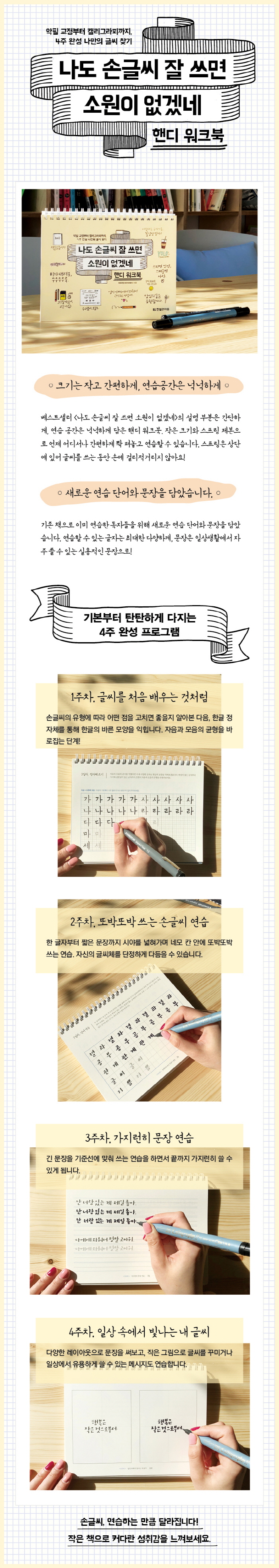 Ãâ°£ Áï½Ã º£½ºÆ®¼¿·¯°¡ µÈ <³ªµµ ¼Õ±Û¾¾ Àß ¾²¸é ¼Ò¿øÀÌ ¾ø°Ú³×>ÀÇ ±¸¼ºÀº ±×´ë·Î, ¿¬½À ´Ü¾î¿Í ¹®ÀåÀº »õ·Ó°Ô ´ãÀº ¡®ÇÚµð ¿öÅ©ºÏ¡¯ÀÔ´Ï´Ù. ±Û¾¾ ¿¬½À °ø°£ÀÌ ´õ ÇÊ¿äÇÑ µ¶ÀÚµé, °£ÆíÇÑ »çÀÌÁî¿Í ½ºÇÁ¸µ Á¦º»À» ¿øÇÑ µ¶ÀÚµéÀÇ ÀǰßÀ» ¹Ý¿µÇÏ¿© ¸¸µé¾ú½À´Ï´Ù. ±Û¾¾¸¦ óÀ½ ¹è¿ì´ø ¶§·Î µ¹¾Æ°¡ ÆæÀ» ¹Ù¸£°Ô Áã°í ÇÑ±Û ¸ð¾çÀ» ÀÍÈ÷´Â °ÍºÎÅÍ ½ÃÀÛÇØ¼ ³ª¿¡°Ô ¸Â´Â ÇÊü¸¦ ã¾Æ ¿¹»Û ¸Þ½ÃÁö Ä«µå¸¦ ¾µ ¼ö ÀÖ´Â ´Ü°è±îÁö 4ÁÖ ¿Ï¼º ÇÁ·Î±×·¥À» ÁøÇàÇÕ´Ï´Ù. Â÷±ÙÂ÷±Ù ÀÚ½ÅÀÇ ¼Õ±Û¾¾¸¦ ´ÙµëÀ¸¸ç °³¼º ÀÖ°í ¿¹»Û ¼Õ±Û¾¾¸¦ ¿Ï¼ºÇغ¸¼¼¿ä.