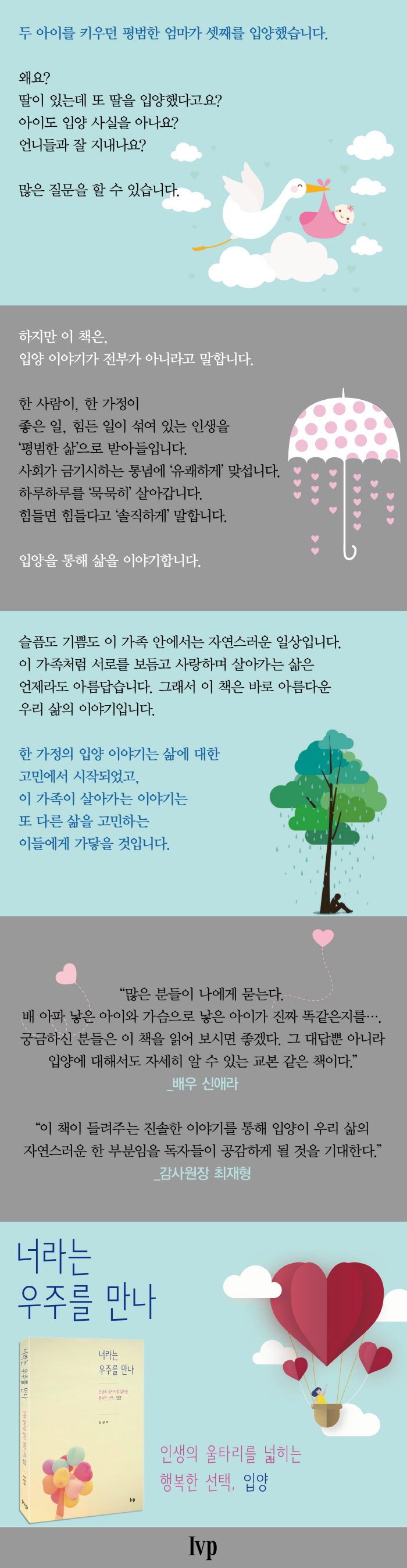 µ¹¾Æº¸¸é µÎ ¾ÆÀ̸¦ ³º°í ÈñÀºÀ̸¦ ÀÔ¾çÇØ¼ ¼¼ ¾ÆÀ̸¦ Ű¿î °ÍÀÌ ³» Àλý¿¡¼ °¡Àå ÀßÇÑ ÀÏÀÎ °Í °°´Ù. ´õ ¸¹Àº ¾ÆÀ̸¦ ÀÔ¾çÇÏÁö ¸øÇØ ¾ÈŸ±î¿î ¸¶À½¸¶Àú µç´Ù. ³»°¡ ¾ÆÀÌ Çϳª ÀÔ¾çÇß´Ù°í ¼¼»óÀÌ ´Þ¶óÁö°Ú´Â°¡¸¶´Â, ÀÔ¾çµÈ ¾ÆÀÌÀÇ ¼¼»óÀº ºÐ¸í ´Þ¶óÁú °ÍÀ̶ó°í ¹Ï±â ¶§¹®ÀÌ´Ù. ³ª´Â ÀÌ Ã¥¿¡¼ ÈñÀºÀ̸¦ ÀÔ¾çÇϱâ±îÁöÀÇ °úÁ¤°ú ¾ÆÀ̸¦ Ű¿ì¸é¼ ÁÂÃæ¿ìµ¹ÇÑ °æÇèÀ» ¼ÖÁ÷ÇÏ°Ô Àû¾ú´Ù. ³»°¡ ¾ÆÀ̸¦ Ű¿ì±â¿¡ ¾ó¸¶³ª ºÎÀûÇÕÇÑ »ç¶÷ÀÎÁö, ¾ó¸¶³ª °ÆÁ¤ÀÌ ¸¹¾Ò´ÂÁö ±×´ë·Î Ç¥ÇöÇß´Ù. ¡°ÁÁÀº ÀÏ Çϼ̳׿ä. ÈǸ¢ÇϽʴϴ١±¶ó°í ÀλçÇÏ´Â »ç¶÷µé¿¡°Ô ³»°¡ ±×´ÙÁö ÈǸ¢ÇÑ »ç¶÷ÀÌ ¾Æ´Ï¶ó´Â °É º¸ÀÌ°í ½Í¾ú´Ù.