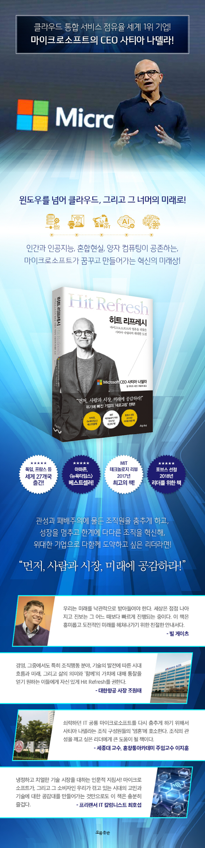 ÀÎÅÍ³Ý ºê¶ó¿ìÀú¿¡¼ »õ·Î°íħ(F5) ¹öưÀ» ´©¸£¸é Ç÷§ÆûÀº ³²°í ÄÜÅÙÃ÷´Â ÀüÇô »õ·Î¿î °ÍÀ¸·Î ¹Ù²î°Ô µÈ´Ù. ¡®È÷Æ® ¸®ÇÁ·¹½Ã(Hit Refresh)!¡¯ ±×°ÍÀº º»ÁúÀ̶ó´Â Åä´ë À§¿¡ º¯È¿Í Çõ½ÅÀ» ÀÔÈ÷´Â °ÍÀÌ´Ù. ÀÌ´Â 40¿© ³â µ¿¾È ¼¼°è ÃÖ°í ±â¾÷ÀÇ ÀÚ¸®¸¦ ÁÙ°ð ÁöÄÑ ¿Ô´ø ¸¶ÀÌÅ©·Î¼ÒÇÁÆ®ÀÇ ÀåÁ¡Àº ±×´ë·Î »ì¸®¸é¼ ½Ã´ë¿¡ ¸ÂÃß¾î »õ·Î¿î ºñÀü°ú ¹Ì¼ÇÀ» °¡Áø ±â¾÷À¸·Î º¯¸ðÇÏ´Â °úÁ¤¿¡ ´ëÇÑ ÀºÀ¯Àû Ç¥ÇöÀ̱⵵ ÇÏ´Ù.