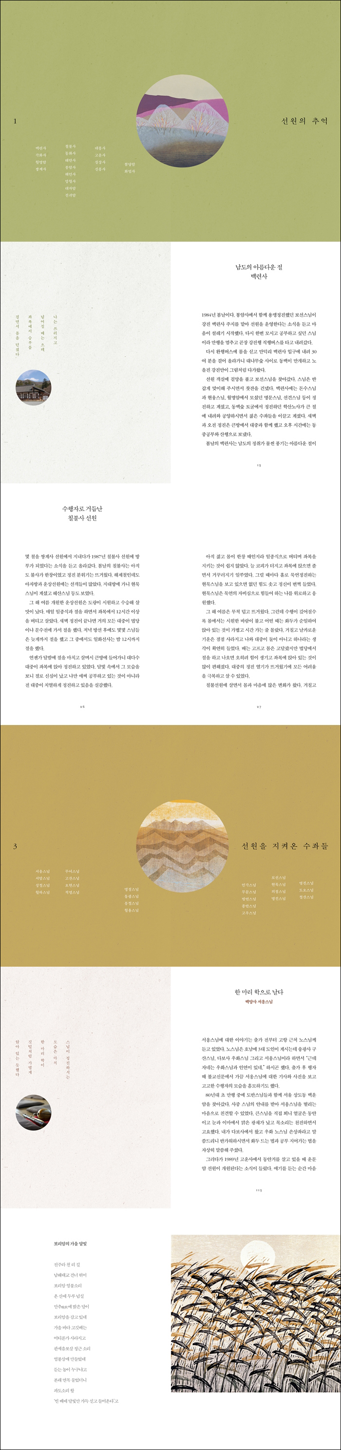* 1ºÎ <¼±¿øÀÇ Ãß¾ï>Àº 40³â ¼öÁ°¡ Ãâ°¡ Ãʱâ Á¤ÁøÇß´ø Ãß¾ïÀÇ ¼±¿ø¿¡¼ºÎÅÍ ÃÖ±Ù ¼öÇàÇÑ ¼±¿ø¿¡ ´ëÇÑ ¼ÖÁ÷Çϸ鼵µ ´ã¹éÇÑ ±â·ÏÀÌ´Ù. ¹é·Ã»ç, °¢È»ç, ¿ù¸í¾Ï, ½Ö°è»ç, Ä¥ºÒ»ç, µ¿È»ç, žȻç, ºÀ¾Ï»ç, ÇØÀλç, ¸Á¿ù¾Ï, ´ëÀÚ¾Ï, Áø±Í¾Ï, °í¿î»ç, ´ëÈï»ç µî ÀÌ ¶¥ÀÇ ´ëÇ¥ÀûÀÎ ¼±¿øÀÇ Ç³°æ°ú ±× °÷¿¡¼ ¼öÇàÇÏ´Â ¼öÁµéÀÇ Ä¡¿Çϸ鼵µ ¶§·Î´Â ³¶¸¸ÀûÀÎ ¸ð½ÀÀ» ´ã¾Ò´Ù.