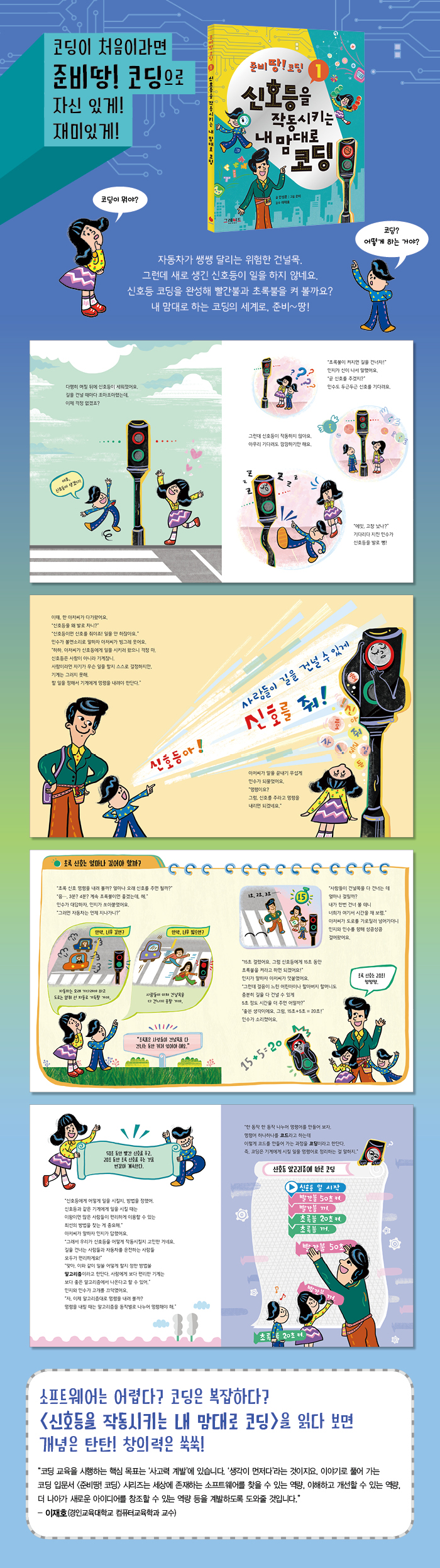 ½ÅÈ£µîÀÌ ¾ø¾î¼ ±æÀ» °Ç³Ê±â À§ÇèÇß´ø °Ç³Î¸ñ¿¡ ½ÅÈ£µîÀÌ »ý°å¾î¿ä. ±×·±µ¥ ¹ÎÁö¿Í ¹Î¼ö°¡ ¾Æ¹«¸® ±â´Ù·Áµµ ½ÅÈ£µîÀÌ ºÒÀ» ÄÑÁö ¾Ê¾Æ¿ä. ¿Ö ±×·± °É±î¿ä? ½ÅÈ£µî°ú °°Àº ±â°è´Â ÇÁ·Î±×·¥ÀÌ ÀÖ¾î¾ß ÀÛµ¿ÇØ¿ä. ¹ÎÁö¿Í ¹Î¼ö´Â »ç¶÷°ú ÀÚµ¿Â÷°¡ ¾ÈÀüÇÏ°Ô ¿À°¥ ¼ö ÀÖµµ·Ï ½ÅÈ£µî ÇÁ·Î±×·¥À» ¸¸µé±â ½ÃÀÛÇØ¿ä. ¾ÆÀ̵éÀÌ ½ÅÈ£µîÀ» ÀÛµ¿½Ãų ¹æ¹ý(¾Ë°í¸®Áò)À» Á÷Á¢ ±Ã¸®Çϰí ÇÁ·Î±×·¥À¸·Î ¸¸µå´Â À̾߱⸦ ÅëÇØ ÄÚµùÀÇ ±âº» °³³äÀ» ÀÚ¿¬½º·´°Ô ÀÍÈú ¼ö ÀÖµµ·Ï ±¸¼ºÇÑ Áö½Ä ±×¸²Ã¥ÀÔ´Ï´Ù.