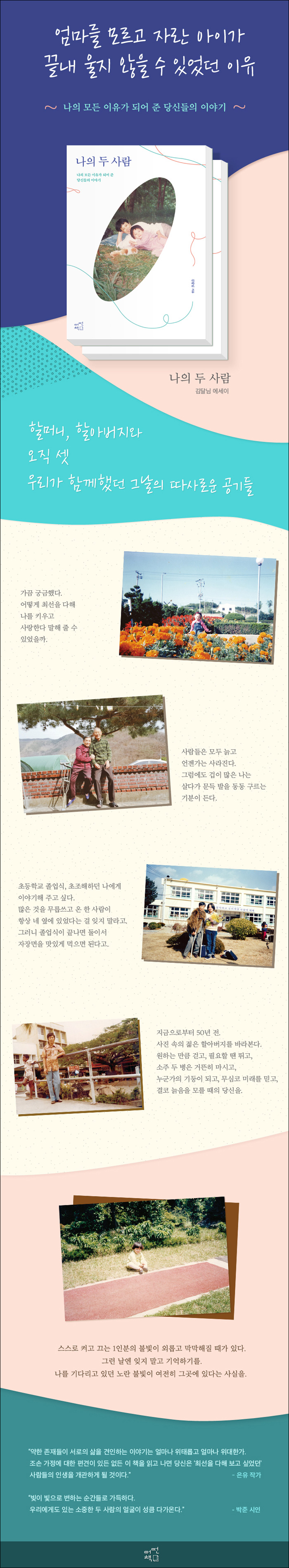 ÀºÀ¯ (¡¶½Î¿ï ¶§¸¶´Ù Åõ¸íÇØÁø´Ù¡· ÀúÀÚ) : ÀÏÀÏ¿¬¼Ó±Ø º¸µíÀÌ ´ÙÀ½À» ÀçÃËÇϸç Ã¥ÀåÀ» ³Ñ°å´Ù. 50ÀÇ ³ªÀÌ¿¡ ´Ù½Ã ºÎ¸ð°¡ µÈ ÇҾƹöÁö¿Í ÇÒ¸Ó´Ï´Â ¾ÆÀÌ µîÀÌ ¹Ù´Ú¿¡ ´êÀ»¼¼¶ó ¼Õ³à¸¦ ±ØÁøÈ÷ µ¹º¸°í, ¼Õ³à´Â ¡®°°ÀÌ-ÀÖÀ½¡¯ ±× ÀÚü·Î µÎ »ç¶÷ÀÇ ÀÏ»ó¿¡ È°±â¿Í ¿Â±â¸¦ ÀüÇÑ´Ù. ¾àÇÑ Á¸ÀçµéÀÌ ¼·ÎÀÇ »îÀ» °ßÀÎÇÏ´Â À̾߱â´Â ¾ó¸¶³ª À§ÅÂ·Ó°í ¾ó¸¶³ª À§´ëÇѰ¡. ´ã¹éÇÏ°Ô ½á ³»·Á°£ ¹®Ã¼, ¼Ò¼ÒÇÏ°Ô ±â·ÏÇÑ »îÀÇ ¼¼¸ñµé¿¡ ³ªµµ ¸ð¸£°Ô Á¥¾î µé¾ú´Ù. °¡³ÀÌ ¼·¯¿ö¼ ¿ï°í ´ÙÁ¤ÀÌ ºÎ·¯¿ö¼ ¿ï¾ú´Ù. Á¶¼Õ °¡Á¤¿¡ ´ëÇÑ Æí°ßÀÌ ÀÖµç ¾øµç ÀÌ Ã¥À» ÀÐ°í ³ª¸é ´ç½ÅÀº ¡°ÃÖ¼±À» ´ÙÇØ º¸°í ½Í¾ú´ø¡± »ç¶÷µéÀÇ ÀλýÀ» °³°üÇÏ°Ô µÉ °ÍÀÌ´Ù.