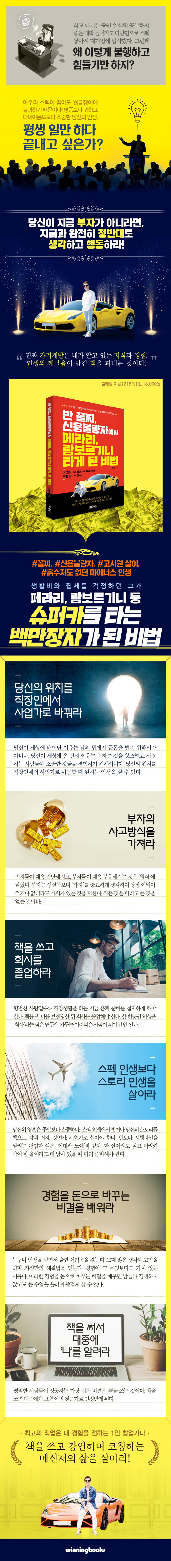 ÃÊ¡¤Áß¡¤°íµîÇб³ 16±ÇÀÇ ±³°ú¼¿¡ ±ÛÀÌ ¼ö·ÏµÇ¾ú°í, ÇØ¿Ü ¿©·¯ ³ª¶ó¿¡ ÀúÀÛ±ÇÀÌ ¼öÃâµÇ¾î Ãâ°£µÇ¾ú´Ù. 35¼¼¿¡ 100±ÇÀÇ Ã¥À» Æì³» 2011³â <´ëÇѹα¹±â·Ï¹®È´ë»ó>À» ¼ö»óÇß°í, 2012³â <´ëÇѹα¹ ½ÅâÁ¶ÀÎ ´ë»ó>, 2013³â <µµÀüÇѱ¹ÀÎ ´ë»ó>, 2016³â <´ëÇѹα¹ ÃÖ°í±â·ÏÀÎÁõ>, 2017³â <´ëÇѹα¹ °ø°¨ºê·£µå Çõ½Å°æ¿µ ´ë»ó>, <´ëÇѹα¹ ¹Ì·¡°æ¿µ ´ë»ó>, <ÀþÀºÀ̵éÀÌ ¼±È£ÇÏ´Â ´ëÇѹα¹ ¼ÒºñÀÚ ½Å·Ú ºê·£µå ´ë»ó>, <ÄÚ¸®¾Æ Çõ½Å ´ë»ó>, <Çѱ¹À» ºû³½ ÀÚ¶û½º·± Çѱ¹ÀÎ ´ë»ó>, 2018³â <ÄÚ¸®¾Æ º£½ºÆ® ÀÇÁ¤&¹Ì·¡¸¦ ¿©´Â »ê¾÷ ´ë»ó Çõ½Å±³À°ÀÎ ´ë»ó>, <´ëÇѹα¹Çõ½Å´ë»ó Ã¥¾²±â ÄÚĪ ºÎ¹® ´ë»ó>, <Çѱ¹ºê·£µå¸¸Á·Áö¼ö ±³À°(Ã¥¾²±â ÄÚĪ) ºÎ¹® 1À§>, <¸Ó´ÏÅõµ¥ÀÌ ºê·£µå ÆÄ¿ö ´ë»ó Ã¥¾²±â ÄÚĪ ºÎ¹® ´ë»ó>, <Çѱ¹¼ÒºñÀÚÆò°¡ 1À§ Ã¥¾²±â ÄÚĪ ºÎ¹® ´ë»ó>, <¿ÃÇØÀÇ¿ì¼öºê·£µå´ë»ó Ã¥¾²±â ÄÚĪ ºÎ¹® 1À§>, 2019³â <¿ÃÇØÀÇ ¿ì¼öºê·£µå´ë»ó Ã¥¾²±â ÄÚĪ ºÎ¹® 1À§>¸¦ ¼ö»óÇß´Ù. ÁöÀº Ã¥À¸·Î ¡¶Æò¹üÇÑ »ç¶÷À» 1°³¿ù ¸¸¿¡ ÀÛ°¡·Î ¸¸µå´Â Ã¥¾²±â Ư°¡·, ¡¶±è ´ë¸®´Â ¾î¶»°Ô 1°³¿ù ¸¸¿¡ ÀÛ°¡°¡ µÆÀ»±î¡·, ¡¶³»°¡ 100¾ï ºÎÀÚ°¡ µÈ 7°¡Áö ºñ¹Ð¡· ¿Ü 250±ÇÀÌ ÀÖ´Ù. ÇöÀç À¯Æ©ºê ä³Î <±èµµ»çTV>¿Í <³×ºô°í´ÙµåTV>¸¦ ¿î¿µÇϸç 1ÀÎ Å©¸®¿¡ÀÌÅͷεµ Ȱ¹ßÈ÷ Ȱµ¿Çϰí ÀÖ´Ù.