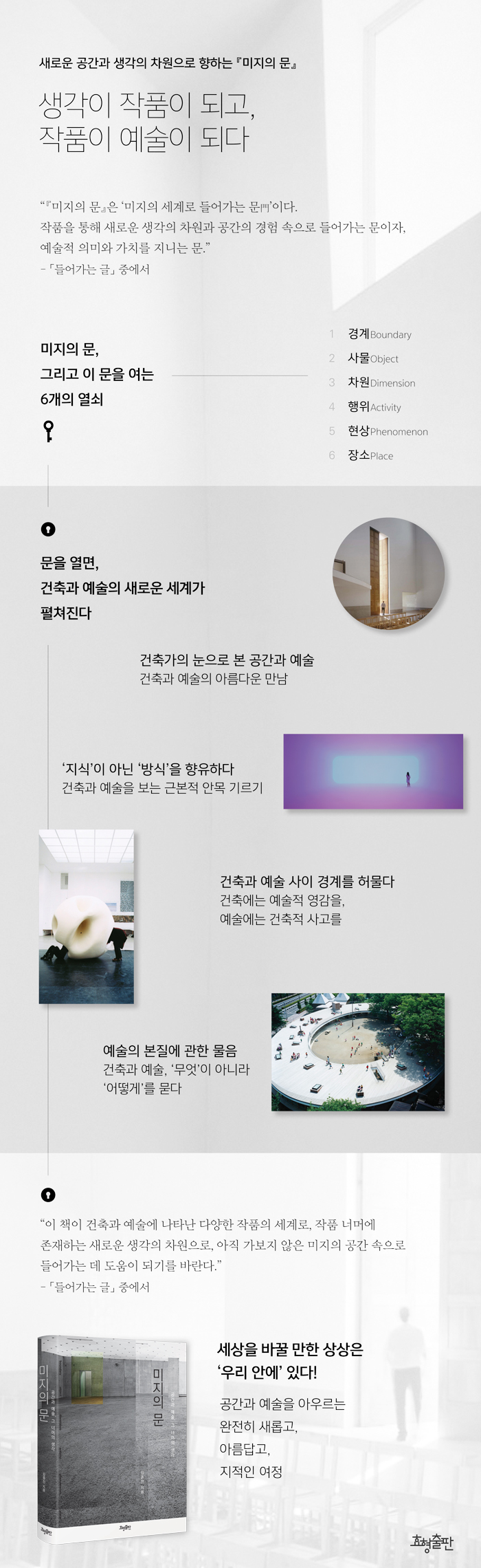 ÀÌ Ã¥¿¡¼´Â ¡®°æ°è¡¯, ¡®»ç¹°¡¯, ¡®Â÷¿ø¡¯, ¡®ÇàÀ§¡¯, ¡®Çö»ó¡¯, ¡®Àå¼Ò¡¯¶ó´Â 6°³ÀÇ Å°¿öµå¸¦ ³»¼¼¿ö ¾î·Æ°Ô¸¸ ´À²¸Áö´Â ÀüÀ§ÀûÀÎ °ÇÃà°ú ¿¹¼ú ÀÛǰÀ» À̾߱âÇÑ´Ù. ÀúÀÚ°¡ °ÇÃà°¡ÀÎ ¸¸Å °¢Á¾ °ÇÃ๰°ú ¼³°è¾ÈÀÌ ÀûÁö ¾ÊÀº ºÎºÐÀ» Â÷ÁöÇÏÁö¸¸ ÀÌ Ã¥Àº ÁÖÀú ¾øÀÌ ºÐ¾ß¸¦ ³Ñ³ªµé¸ç ¼³Ä¡ ¹× °³³ä ¹Ì¼úÀÌ ÁÖ¸¦ ÀÌ·ç´Â Çö´ë ¹Ì¼ú ÀÛǰ, ½ÉÁö¾î öÇаú ¹®ÇÐ, À½¾Ç°ú Àϻ󿡼 ½±°Ô Á¢ÇÒ ¼ö ÀÖ´Â »ç·Ê¿¡¼µµ ¸Å¿ì ´Ù¾çÇÑ ¿¹¸¦ ¼Ò°³ÇÑ´Ù.