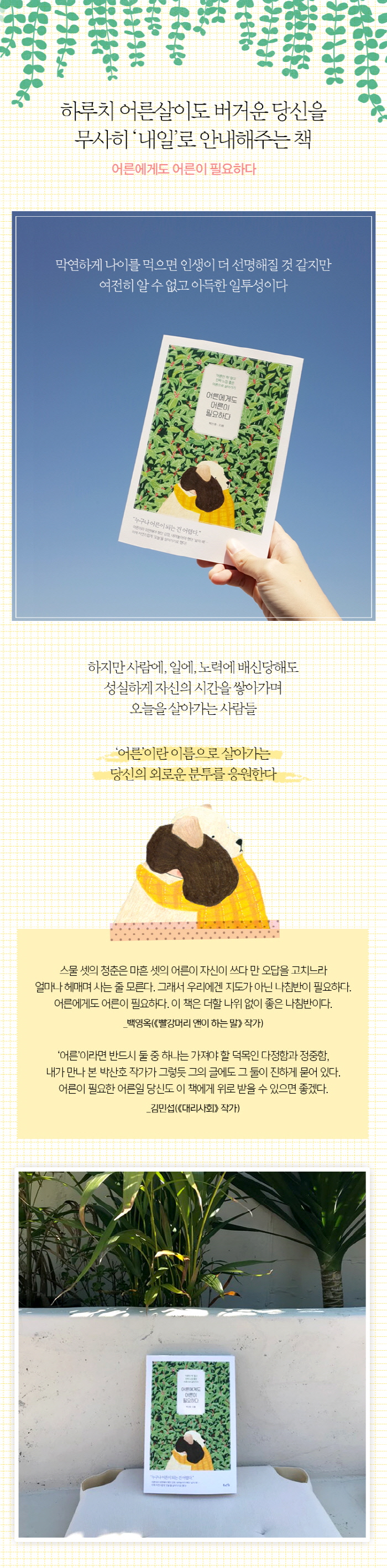 Ã¥À» ÀÐÀ¸¸é¼ ³»°¡ ¾ÆÁ÷ ¾î¸¥ÀÌ ¾Æ´Ñ °ÍÀ» ¾Ë¾Ò°í, ¿©ÀüÈ÷ ¾î¸¥ÀÌ ÇÊ¿äÇÑ Á¸ÀçÀÓÀ» ¾Ë¾Ò°í, ¡®Á¤¸» ´ÙÇàÀÌ´Ù¡¯ ½ÍÀº ½ÉÁ¤ÀÌ µÇ°í ¸»¾Ò´Ù. ¹Ú»êÈ£ ÀÛ°¡ÀÇ ±ÛÀº ´ÙÁ¤Çϰí, Á¤ÁßÇÏ´Ù. ¡®¾î¸¥¡¯À̶ó¸é ¹Ýµå½Ã µÑ Áß Çϳª´Â °¡Á®¾ß ÇÒ ´ö¸ñÀÎ ´ÙÁ¤ÇÔ°ú Á¤ÁßÇÔ, ³»°¡ ¸¸³ª º» ±×°¡ ±×·¸µí ±×ÀÇ ±Û¿¡µµ ±× µÑÀÌ ÁøÇÏ°Ô ¹¯¾î ÀÖ´Ù. ¾î¸¥ÀÌ ÇÊ¿äÇÑ ¾î¸¥ÀÏ ´ç½Åµµ ÀÌ Ã¥¿¡°Ô À§·Î ¹ÞÀ» ¼ö ÀÖÀ¸¸é ÁÁ°Ú´Ù.