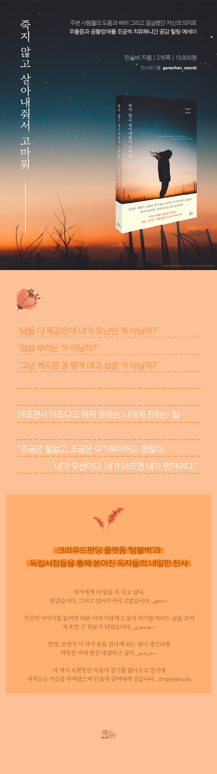 ½èÁö¸¸, ³²µéº¸´Ù Á¶±Ý ´ÊÀº »îÀ» »ì¾Æ°¥ »ÓÀÌ´Ù. ÇÏÁö¸¸ À̰͵µ ³ª»ÚÁö´Â ¾Ê´Ù. ¿ÀÈ÷·Á ÁÁÀ» ¼öµµ ÀÖ°Ú´Ù. »çÃá±â·Î °í¹ÎÇØµµ ºÎÁ·ÇÒ ¾î¸° ½ÃÀýºÎÅÍ ¿ì¿ïÁõ°ú °øÈ²Àå¾Ö·Î ¸¹ÀÌ ¾ÆÆÍ´Ù. ´ëÇп¡ ÁøÇÐÇÏ°í¼´Â Á×µµ·Ï Æò¹üÇÏ°Ô »ì°í ½ÍÀº Àý½ÇÇÑ ÀÌÀ¯°¡ »ý°Ü Ä¡·á¿¡ Àü³äÇß´Ù. ¶§·Î´Â ÆøÇ³Ã³·³, °¡²ûÀº °í¿äÇÑ »õº®³è °°´ø ´ç½ÃÀÇ °¨Á¤°ú °¨¼ºÀ» SNS¿¡ ±Û·Î Àû¾î³ª°¬´Ù. 2018³â Å©¶ó¿ìµåÆÝµù Ç÷§Æû ¡®ÅÒºí¹÷¡¯À» ÅëÇØ µ¶¸³ÃâÆÇ¹° ¡¶Á×Áö ¾Ê°í »ì¾Æ ³»Á༠°í¸¶¿ö¡·¸¦ Ãâ°£, ÀÚ½Åó·³ ¸¶À½ÀÇ º´À» ¾È°í »ì¾Æ¿Ô´ø µ¶Àڵ鿡°Ô ¶ß°Å¿î °ø°¨ÀÇ ¹Ú¼ö¸¦ ¹Þ¾Ò´Ù. °ÅÀÎÀÇ ¾î±ú·Îµµ Áû¾îÁú ¼ö ¾øÀ» °Í¸¸ °°Àº °æÇèÀÇ ¹«°Ô¸¦ ÅëÇØ ÇÑ »ç¶÷¿¡°Ô¶óµµ ÀÛÀº À§·Î°¡ µÇ¾úÀ¸¸é ÇÏ´Â ¹Ù¶÷¿¡ Áö±Ýµµ ÆæÀ» µé°í ³ëÆ®¸¦ ²¨³½´Ù.