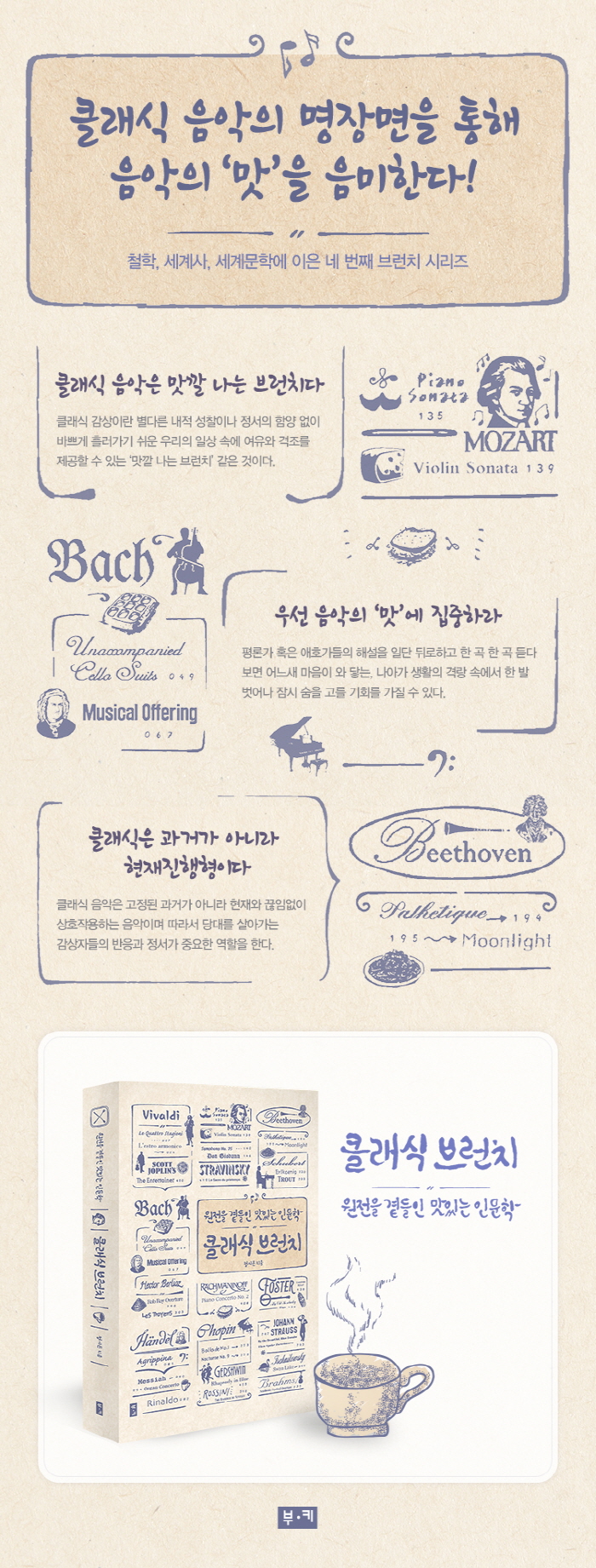 À½¾ÇÀ̶õ ÀÇ¹Ì¿Í °¡Ä¡¸¦ µûÁö±âº¸´Ù ¿ì¼± ±× ¸ÀÀ» ´©·Á¾ß ÇÑ´Ù´Â ±âÄ¡ ¾Æ·¡ ¡®´ëÃ¥ ¾ø´Â °£¼Ä¡(Ê×ßööÂ)¡¯ Á¤½Ã¸óÀÌ ¸À±ò³ª°Ô Â÷·Á ³½ Ŭ·¡½Ä À½¾ÇÀÇ Ç⿬! ¡ºÃ¶ÇÐ ºê·±Ä¡¡» ¡º¼¼°è»ç ºê·±Ä¡¡» ¡º¼¼°è¹®ÇÐ ºê·±Ä¡¡»¿¡ ÀÌÀº ¡®¿øÀüÀ» °çµéÀÎ ¸ÀÀÖ´Â Àι®ÇС¯ ½Ã¸®Áî ³× ¹øÂ° Ã¥À¸·Î, ¹Ù·ÎÅ© ½Ã´ë¸¦ ¿¬ ºñ¹ßµð, ¹ÙÈå, Ç·ÎºÎÅÍ ½ÃÀÛÇØ °íÀüÁÖÀǸ¦ ´ëÇ¥ÇÏ´Â ¸ðÂ÷¸£Æ®, ÇÏÀ̵ç, º£Å亥, ³¶¸¸ÁÖÀÇ À½¾ÇÀ» Àü°³ÇÑ ½´º£¸£Æ®, ¸àµ¨½ºÁ¸, ºê¶÷½º µîÀ» °ÅÃÄ 19¼¼±â ¸»°ú 20¼¼±â ÃÊ ·¯½Ã¾Æ¿Í ¹Ì±¹ÀÇ ÀÛ°î°¡µé¿¡ À̸£±â±îÁö 20¿© ÀÛ°î°¡µé°ú ±×µéÀÇ ÀÛǰÀ» ÁغñÇß´Ù. À§´ëÇÑ Å¬·¡½Ä ÀÛ°î°¡µéÀÇ ¹ßÀÚÃ븦 ÅëÇØ ±×µéÀÌ ÀÌ·èÇØ ³½ °ÉÀÛµéÀ» °¨»óÇϰí ÀÌÇØÇÏ´Â µ¥ µµ¿òÀÌ µÉ Á¤º¸¿Í ´Ü¼¸¦ Á¦°øÇÑ´Ù.