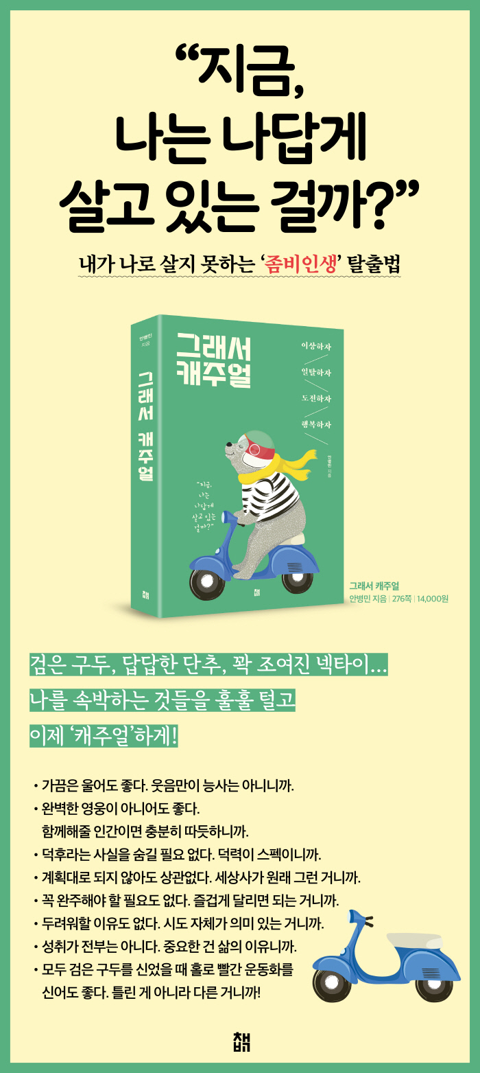 ÀÌ Ã¥ÀÌ µé·ÁÁÖ´Â ¡®Ä³ÁÖ¾ó¡¯ÇÑ »îÀ» »ç´Â À̵éÀÇ À̾߱â´Â ºñ´Ü ÀúÀÚÀÇ °Í»Ó¸¸ÀÌ ¾Æ´Õ´Ï´Ù. À¯¸íÀεéÀÇ µå·¯³ªÁö ¾ÊÀº »î À̸éÀÇ À̾߱âµé°ú ÀúÀÚ º»ÀÎÀÌ »ý»ýÇÏ°Ô Ã¼ÇèÇÏ°í ±ú´ÞÀº »îÀÇ ¹æ½Ä µîÀ» ´Ù¾çÇÏ°Ô ¼Ò°³Çϰí ÀÖ½À´Ï´Ù. ƯÈ÷ °¢ éÅͰ¡ ³¡³ ÈÄ ¸¸³¯ ¼ö ÀÖ´Â ¡®³ëÀÚ¿Í Ä³Á־󡯿¡¼´Â, ¿ª¹ß»óÀÇ °æ¿µÀÚÀÎ ³ëÀÚ Ã¶Çп¡¼ °ÇÁ® ¿Ã¸° ÇູÀÇ Áø¸é¸ð°¡ ±× Áø¼ö¸¦ ´õÇÕ´Ï´Ù.