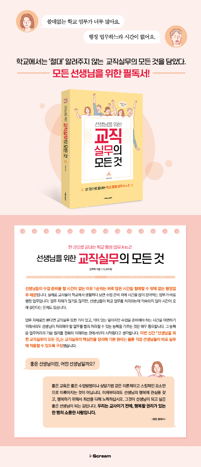 Àú´Â ÀÌ Ã¥À» ÅëÇØ ¼±»ý´Ôµé²²¼ ±³Á÷½Ç¹«¸¦ Á¤È®È÷ ÀÌÇØÇÏ°í ÆÄ¾ÇÇÏ½Ã¾î ºü¸£°Ô ¾÷¹«¸¦ ó¸®ÇÒ ¼ö ÀÖµµ·Ï Áö¿øÇÏ°í ½Í¾ú½À´Ï´Ù. ³ª¾Æ°¡ ¾ÆÀ̵é°ú ÇູÇϰí Áñ°Å¿î ¼ö¾÷À» ÇÒ ¼ö ÀÖµµ·Ï ¼ö¾÷ Áغñ ½Ã°£À» È®º¸Çϴµ¥ µµ¿òÀ» µå¸®°í ½Í¾ú½À´Ï´Ù. ÀÌ Ã¥À» ÀÐÀ¸½Ã´Â ¸ðµç µ¶ÀÚ ¼±»ý´Ôµé²²¼µµ ÄÄÇ»ÅͰ¡ ¾Æ´Ñ ¿ì¸® ¾ÆÀ̵éÀ» ¹Ù¶óº¼ ¼ö ÀÖ´Â ÇູÇϰí ÁÁÀº ±³»ç°¡ µÇ½Ã±æ ¹Ù¶ø´Ï´Ù.