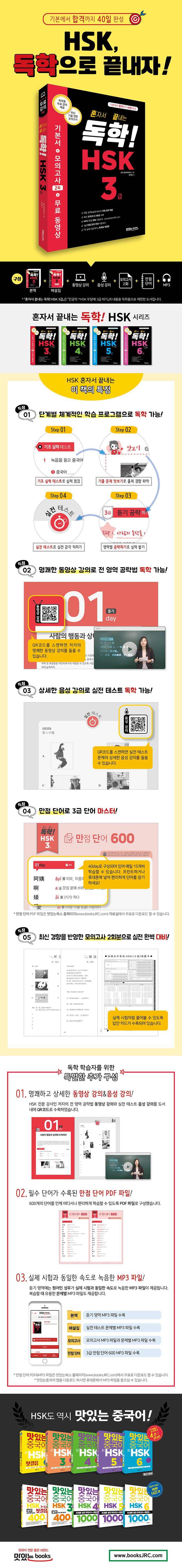 ¡ºÈ¥ÀÚ¼ ³¡³»´Â µ¶ÇÐ! HSK 3±Þ¡»Àº HSK 3±Þ¿¡ óÀ½ µµÀüÇÏ´Â ÇнÀÀÚ°¡ 40ÀÏ µ¿¾È È¥ÀÚ¼ ½ÃÇèÀ» ´ëºñÇÒ ¼ö ÀÖµµ·Ï ±¸¼ºÇÑ µµ¼ÀÔ´Ï´Ù. HSK Àü¹® °»çÀÇ î￵¿ª µ¿¿µ»ó °ÀÇ¿Í ½ÇÀü Å×½ºÆ® À½¼º °Àǰ¡ µµ¼ ¾È¿¡ QRÄÚµå·Î ¼ö·ÏµÇ¾î ÀÖ¾î È¥ÀÚ¼µµ ÇнÀÇÒ ¼ö ÀÖ½À´Ï´Ù. ¸¸Á¡ ´Ü¾î PDF ÆÄÀÏ·Î ´Ü¾î¸¦ ÇнÀÇϸç, ¸ðÀǰí»ç 2ȸºÐÀ¸·Î ÃÖÁ¾ ¸¶¹«¸®¸¦ ÇÒ ¼ö ÀÖ½À´Ï´Ù. ÀÌÁ¦ ¡ºÈ¥ÀÚ¼ ³¡³»´Â µ¶ÇÐ! HSK 3±Þ¡»À¸·Î HSK 3±Þ¿¡ µµÀüÇØ º¸¼¼¿ä!