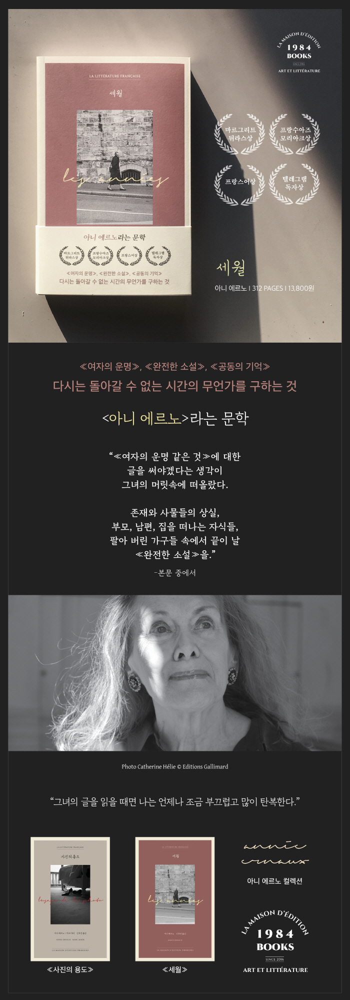 ¾Æ´Ï ¿¡¸£³ëÀÇ ÀÌÀü ÀÛǰµéÀÌ ÀÛ°¡ ÀÚ½ÅÀÇ °æÇè°ú ±â¾ïÀ» ¹ÙÅÁÀ¸·Î ÇÏ´Â ÇÑ °³ÀÎÀÇ ¼»ç¸¦ ´ãÀº ±ÛÀ̾ú´Ù¸é, ¡º¼¼¿ù¡»Àº ÀÛ°¡ÀÇ »õ·Î¿î ¹®ÇÐÀû ½Ãµµ°¡ ÀÌ·ïÁö´Â ÀÛǰÀÌ´Ù. ±×³à°¡ ¡º¼¼¿ù¡»¿¡ ±â·ÏÇÑ ¡®»î¡¯Àº ÀÛ°¡ ÀÚ½ÅÀÇ ±â¾ï¸¸ÀÌ ¾Æ´Ñ ´Ù¼öÀÇ ±â¾ïÀ» Æ÷ÇÔÇϰí ÀÖÀ¸¸ç, ±×°ÍÀº °³ÀÎÀÇ ¿ª»çÀÌÀÚ µ¿½Ã¿¡ ±×³àÀÇ ¼¼¿ù¿¡ ¸Â¹°·Á ÀÖ´Â ´Ù¼öÀÇ ¿ª»çÀ̱⵵ ÇÏ´Ù. ¼Ò¼³ ¼Ó ¡®±×³à¡¯´Â ¾Æ´Ï ¿¡¸£³ë ÀÚ½ÅÀÌ¸é¼ µ¿½Ã¿¡ »çÁø ¼ÓÀÇ Àι°, 1941³âºÎÅÍ 2006³â±îÁö ÇÁ¶û½ºÀÇ »çȸ¸¦ ¹Ù¶óº¸´Â ¿©¼ºÀÇ ½Ã°¢À̰í, ¡®¿ì¸®¡¯¿Í ¡®»ç¶÷µé¡¯Àº ¾ð±ÞµÈ ½Ã´ë ¼Ó¿¡ Çüü ¾øÀÌ ¼û¾î ¹ö¸° Á¶±Ý ´õ Æ÷°ýÀûÀÎ, ºñ°³ÀÎÀûÀÎ ½Ã¼±À̶ó°í ÇÒ ¼ö ÀÖ´Ù. ±×³à°¡ ±â·ÏÇÑ 65³âÀÇ ½Ã°£ ¼Ó¿¡¼, ¸¹Àº °ÍÀÌ ´Þ¶óÁö°í ÀÖ°í ´Þ¶óÁ®¾ß¸¸ ÇÏ´Â Áö±ÝÀÇ ¿ì¸®ÀÇ ¸ð½À°ú ¸¸³ª´Â ÁöÁ¡À» ¾î·ÆÁö ¾Ê°Ô ¹ß°ßÇÒ ¼ö ÀÖ´Ù.