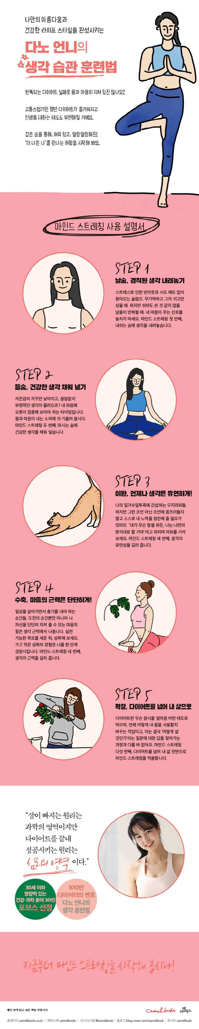 100¸¸ ´ÙÀ̾îÅ͵éÀÇ ¸àÅä ´Ù³ë ¾ð´ÏÀÇ µÎ ¹øÂ° Ã¥ÀÌ Ãâ°£µÈ´Ù. ù ¹øÂ° Ã¥ ¡¶½À°ü ¼ºÇü¡·ÀÌ °Ç°ÇÑ ´ÙÀÌ¾îÆ®¸¦ À§ÇÑ ½À°ü ÈÆ·Ã¹ý¿¡ ´ëÇØ ´Ù·ð´Ù¸é ¡¶¸¶ÀÎµå ½ºÆ®·¹Äª¡·Àº °Ç°ÇÑ ¸ö°ú ¸¶À½À» À§ÇÑ »ý°¢ ½À°üÀ» ´ãÀº Ã¥À¸·Î ¡®¸¶ÀÎµå ¼ºÇü¡¯¿¡ ´ëÇØ ´Ù·é´Ù. ½À°ü ÈÆ·ÃÀº ½Ä½À°ü ¼ºÇü, ¿îµ¿ ½À°ü ¼ºÇü, ¸¶ÀÎµå ¼ºÇü ÀÌ·¸°Ô ¼¼ °¡Áö·Î ³ª´µ´Âµ¥ ±×Áß °¡Àå Áß¿äÇÑ °ÍÀº ´Ü¿¬ '¸¶ÀÎµå ¼ºÇü'ÀÌ´Ù. °Ç°ÇÑ ½À°üÀ» ²Ù¸®´Â Àϵµ, ¿îµ¿ÇÒ ½Ã°£À» ³»´Â Àϵµ °á±¹ ³» ¸¶À½ÀÌ °áÁ¤ÇÏ´Â ÀÏÀ̱⠶§¹®ÀÌ´Ù. »ìÀÌ ºüÁö´Â ¿ø¸®´Â °úÇÐÀÇ ¿µ¿ªÀÌÁö¸¸, ´ÙÀÌ¾îÆ®¸¦ ³¡³» ¼º°ø½ÃŰ´Â ¿ø¸®´Â ½É¸®ÀÇ ¿µ¿ªÀÌ´Ù.